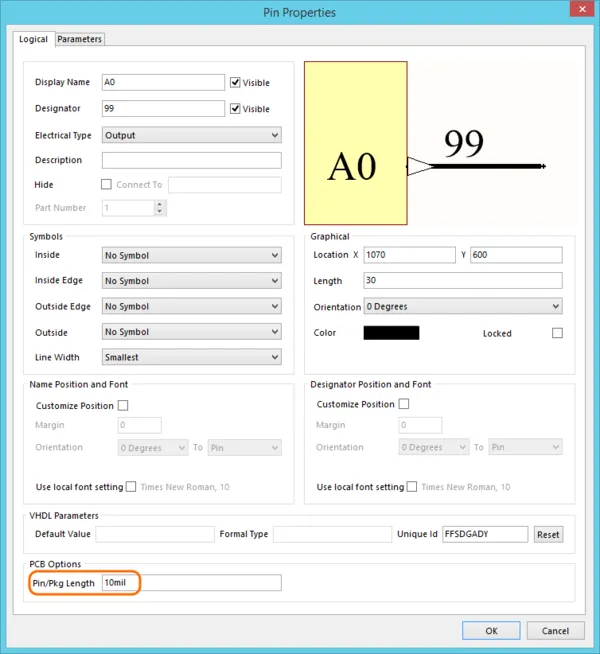 ピンパッケージの配線長は、回路図コンポーネントピンの属性として Pin Properties ダイアログの Pin/Pkg Length 欄で定義できます。配線長の単位は、そのファイルで設定されている単位が使用されます。