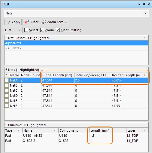 ピンパッケージの配線長 は、自動で Signal Length に含まれます。これは、PCB パネルの様々なモードで表示されます。ネットのピンに関する ピンパッケージの配線長 の値を確認(または、編集)するには、パネルを Nets モードに設定します。Routed Length 欄に配線長が、Signal Length 欄に配線長と、ピンパッケージの配線長を足した値が表示されることに注意してください。
