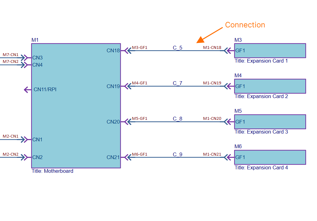 A connection is an object that is placed between module entries in a multi-board schematic document to provide the logical connectivity between modules. Multi-board connections represent the physical connections (plugs and sockets, cables, or harnesses) that are used between the child PCB board designs. Three types of connection are supported: