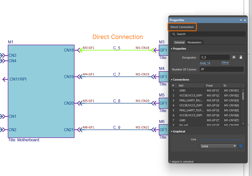 Here is an example of a direct connection between two modules in a multi-board design. In this case connector GF1 on an expansion board (represented by module M3) is to plug in directly to connector CN18 on the system's motherboard (represented by module M1).