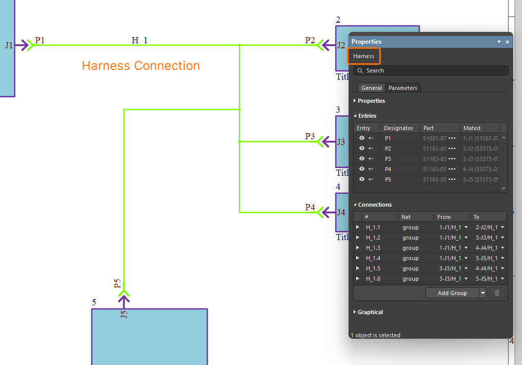 Here is an example of using a single harness to interconnect all modules in a multi-board design. The harness has five connectors (P1-P5) that will plug into the corresponding connectors (J1-J5) on the five child boards in the captured system.