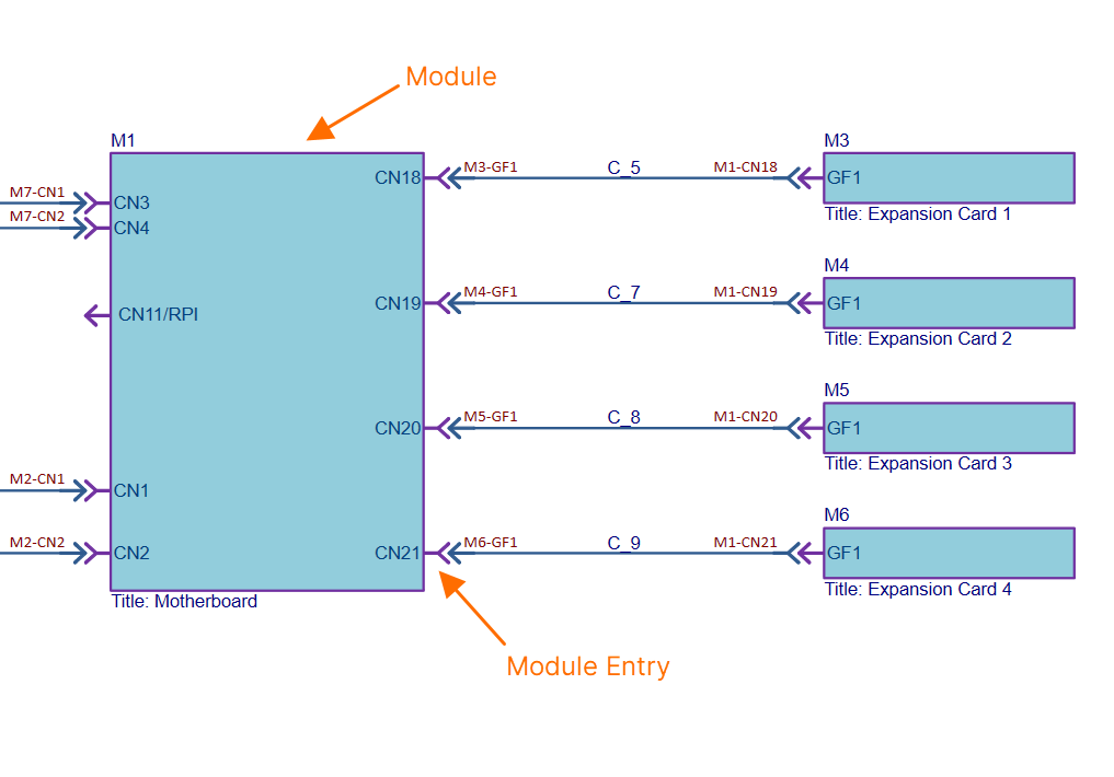 A module represents a child PCB project (and specific PCB therein) within the overall multi-board design. The number of modules placed on the multi-board schematic document will depend on the number of such child boards involved in capturing the complete system design. A module is populated with design data from its linked PCB project during an import process. This processes the pin and net data from the corresponding connector in the child project, which is identified using the special System parameter (with value Connector). Learn more...