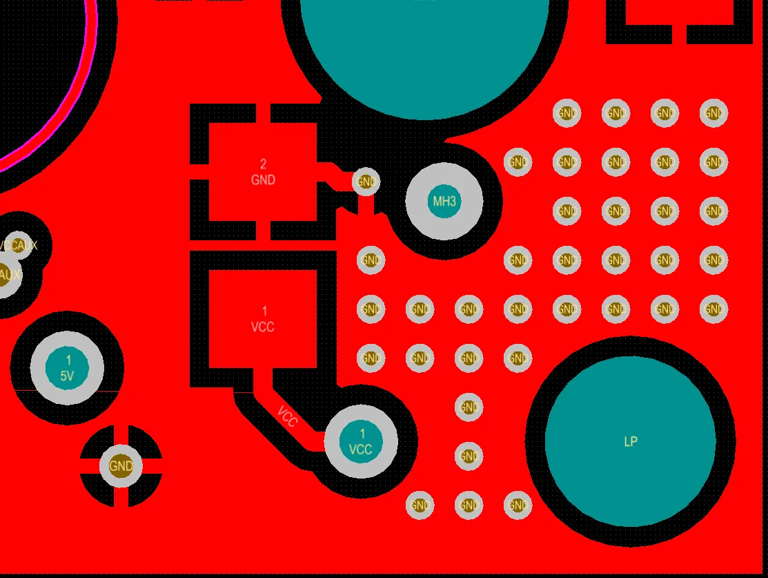 ビアスティッチングは、低インピーダンスで異なるレイヤにある広い銅箔領域同士を効果的に接続するために使用する手法です。RF デザインのスティッチングでは、ビアの壁を作成するためにガードリングと組み合わせて使用します(電磁気を考慮した PCB を作成できます)。また、ビアスティッチングは、孤立するかもしれない銅箔領域を接続するために使用できます。