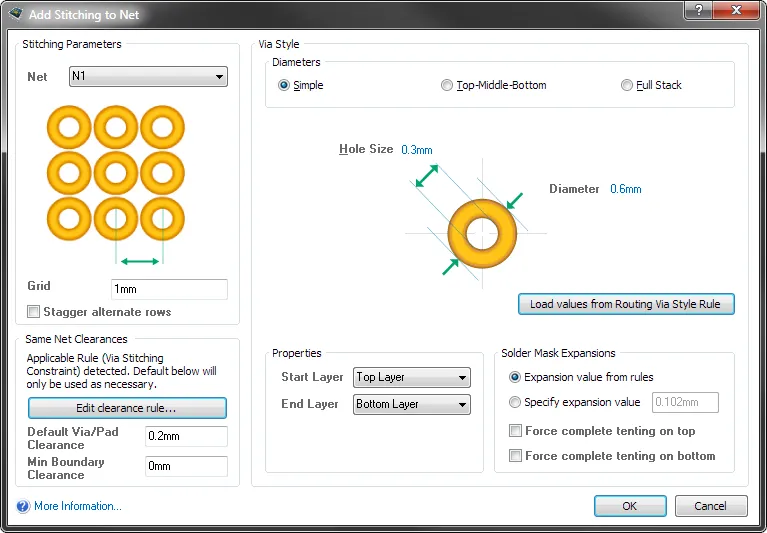 スティッチング Via Style は Add Stitching to Net ダイアログで手動で設定、または、Load values from Routing Via Style Rule ボタンをクリックして Routing Via Style デザインルールからインポートできます。このボタンをクリックすると、Preferred ルール設定がロードされます。