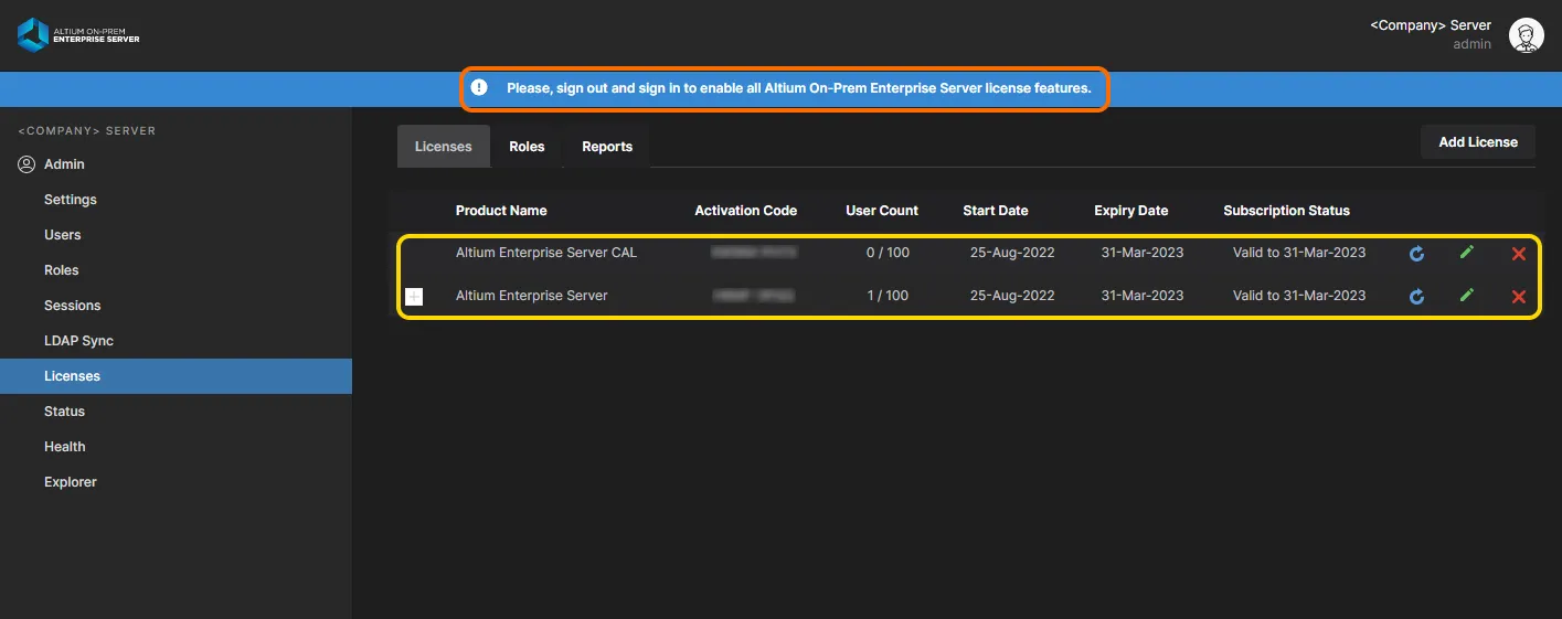 ボタンをクリックします。プロセスが完了すると、Licensesページに取得したライセンスが表示され、Enterprise Serverの機能をアクティベートするためにサインイン/サインアウトするよう指示が表示されます。Altium Enterprise Serverライセンスの1シートが使用され、そのライセンスに関連付けられたUser Countフィールドによって示されます。これは内部の「システム」ユーザーによるものです。