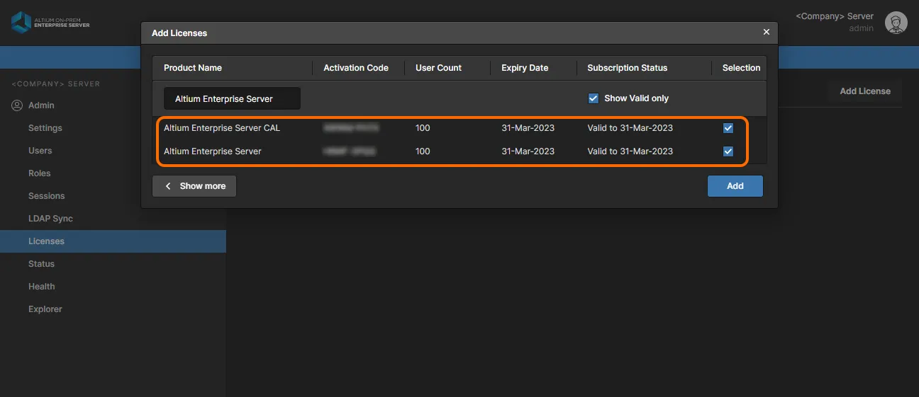 - ライセンスの追加ウィンドウが表示され、企業が利用可能なすべてのAltiumライセンス、Enterprise Serverおよびその他のAltiumソフトウェアのライセンスを含む、一覧が表示されます。Enterprise Serverの機能を有効にするには、有効なAltium Enterprise Serverサーバーライセンスを選択してください。Altium DesignerからEnterprise Serverにユーザーがサインインできるようにするには、有効なAltium Enterprise Server CALライセンス(クライアントアクセスライセンス)も選択してください。