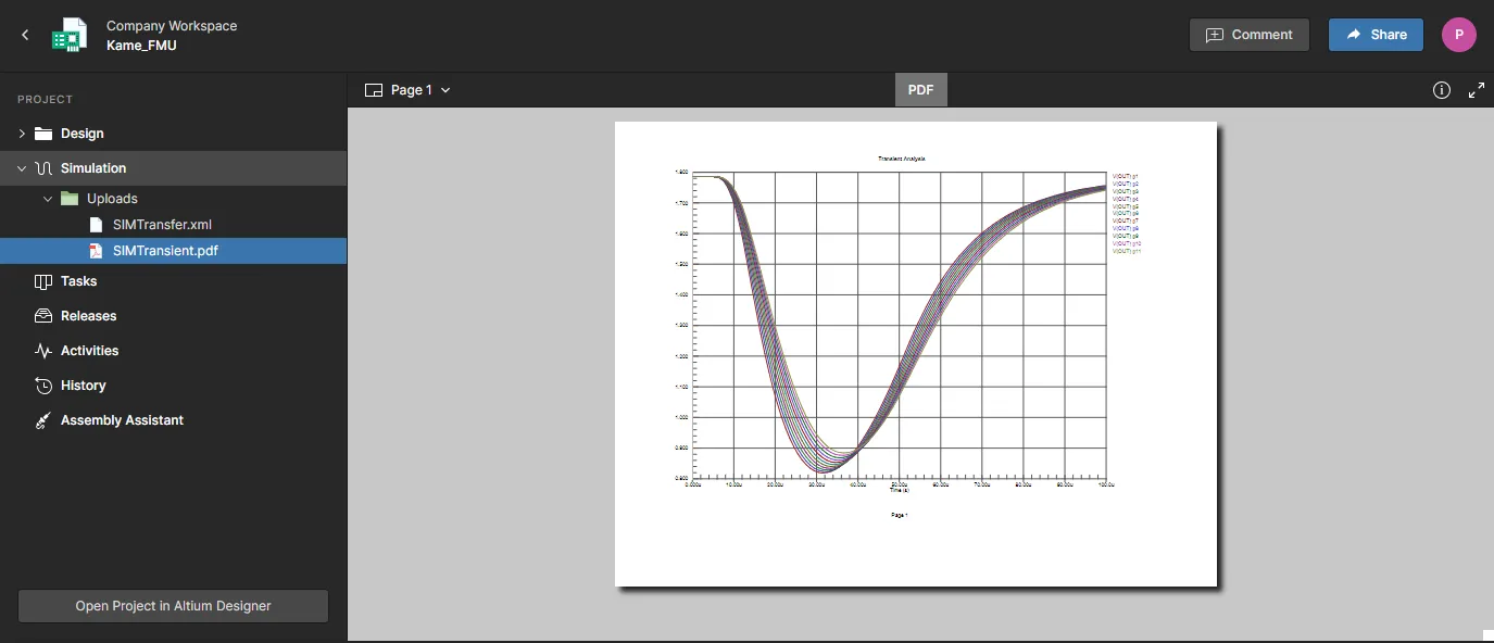 The Simulation page represents a storage location for circuit simulation results files that will be associated with the current project or project release. Imported simulation files are effectively attached to the project, which allows members of the Workspace to inspect and/or download simulation results documents that relate to the currently open project.