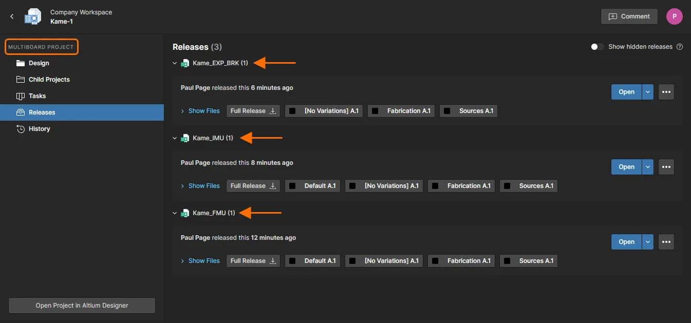The Releases view includes a composite listing of Releases that apply to each of the Multi-board project's child PCB projects. See example.