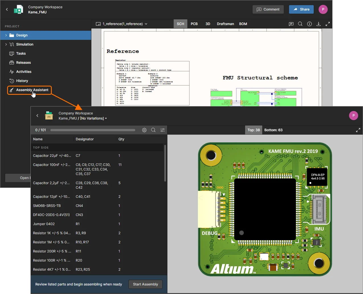 This view provides access to a board assembly process helper application that brings together the project's detailed BOM data and its 2D/3D assembly view. Interaction between the two assembly sources allows you to cross-probe directly between the BOM elements and their graphical representation in the PCB view (2D or 3D).