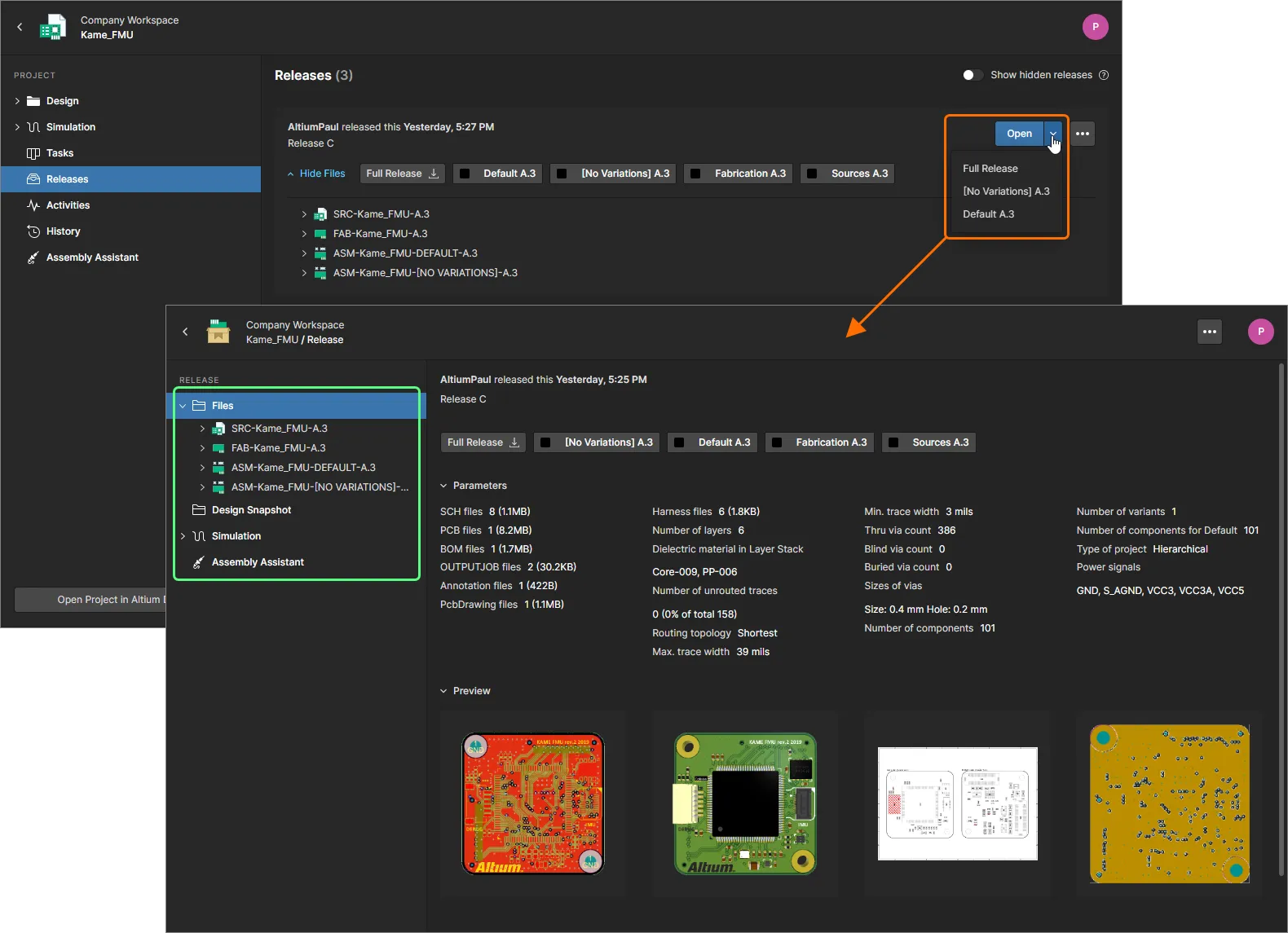 Release event – the ability to open that release package for viewing through a manufacturing portal and the ability to download either the full release package or the source files of the version of the design that was used to create that release package. You can also access the Schematic comparison, PCB Comparison, Gerber comparison, and BOM Comparison features.