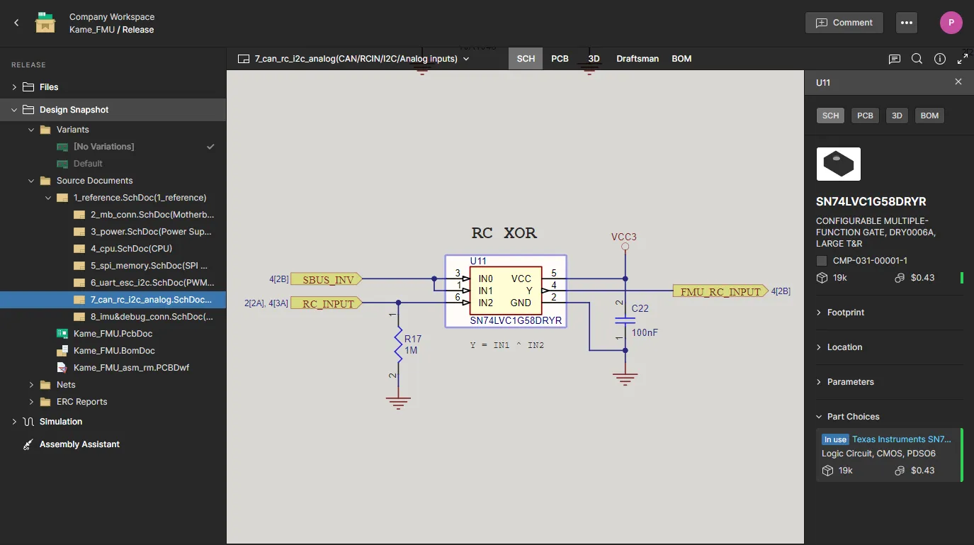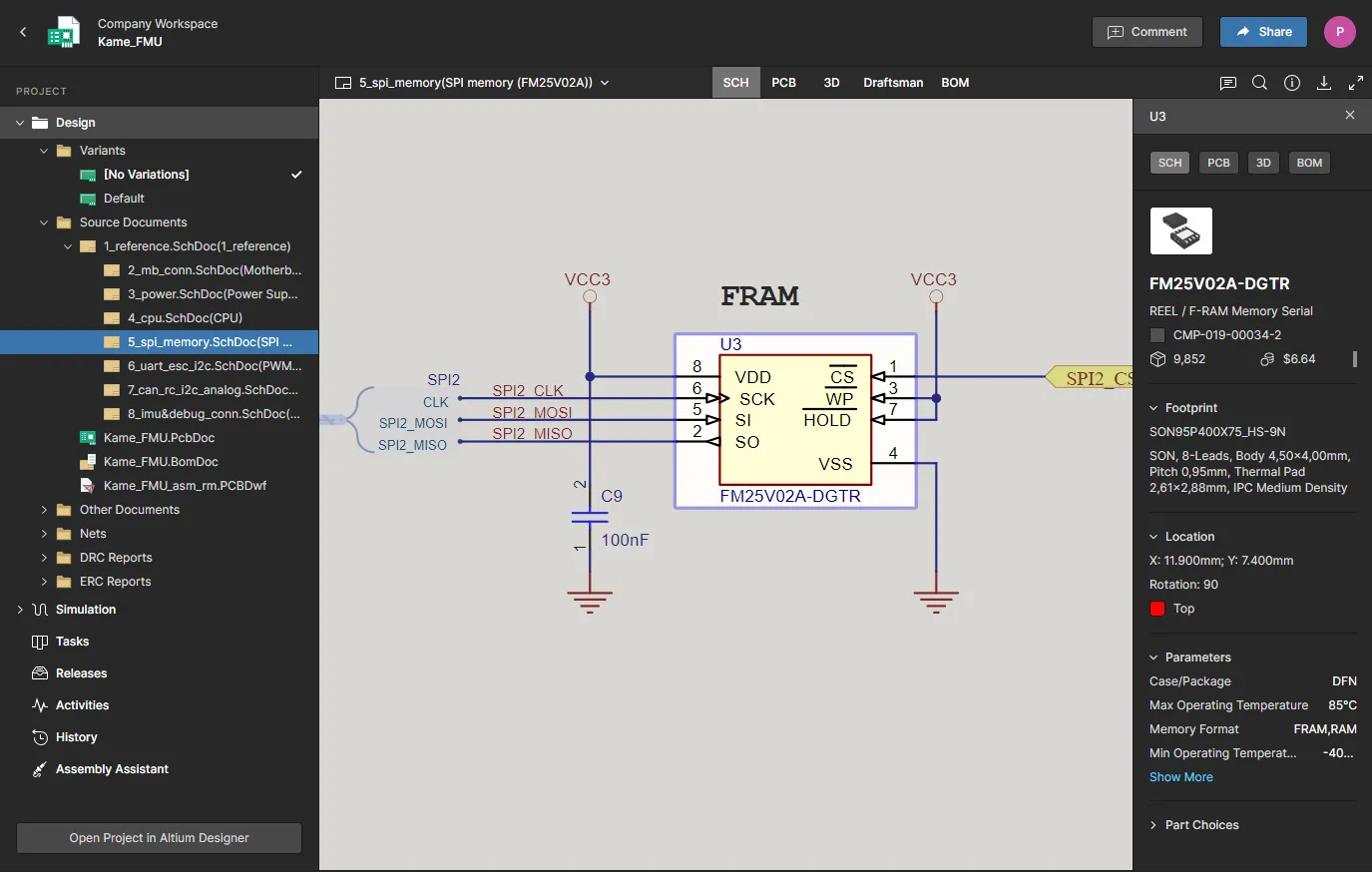 Design – display and navigate source project design documents, view design object properties and place review comments. This view uses the Web Viewer interface to present your design across four distinct data sub-views, to show the source schematic(s), board in 2D and 3D, Draftsman documents, and the Bill of Materials (BOM) respectively. The Design view is for the latest version of the source project data, rather than a specified release from that project, and so could be considered to be a work-in-progress (WIP) view. You can review both the base design and that of any defined Variant.
