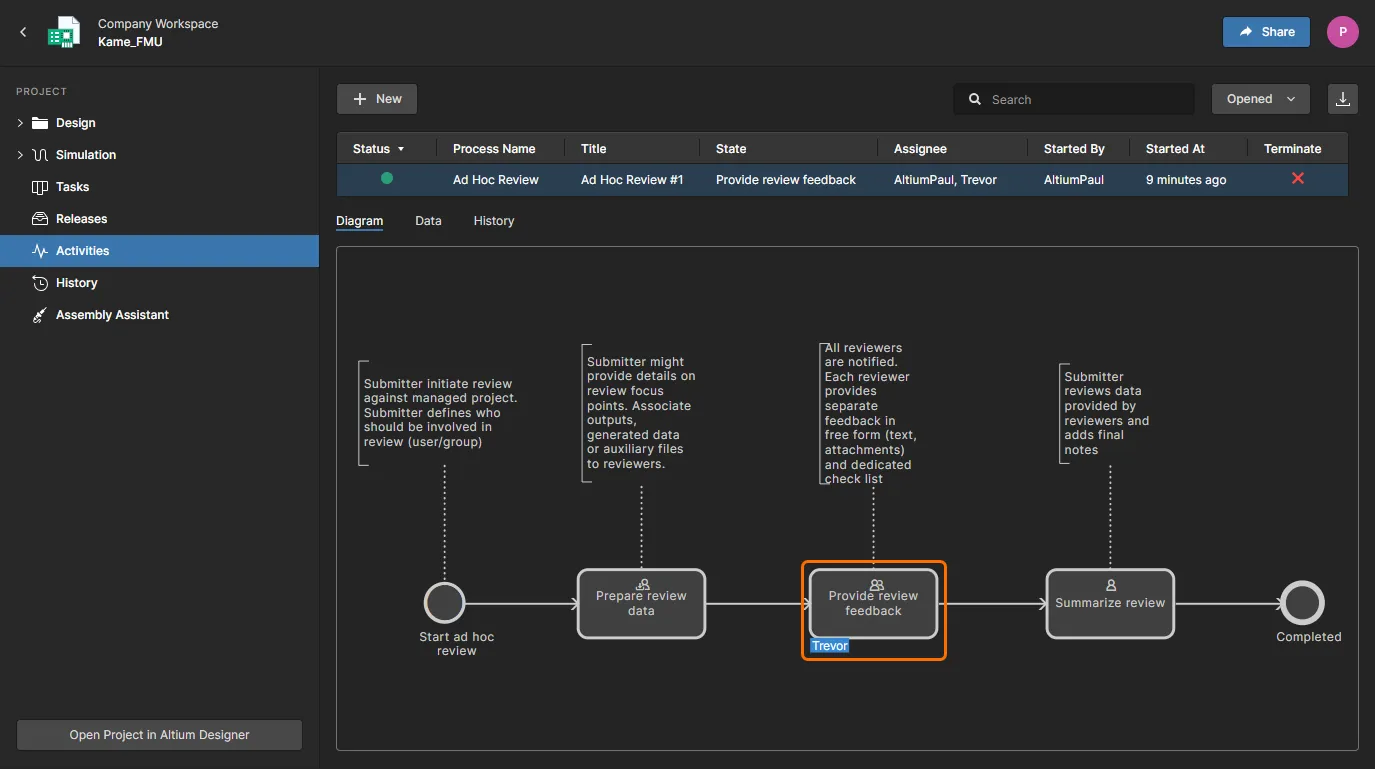 Project activities are typically invoked in Altium Designer by selecting an available process from the Project » Activities menu. The activity is then assigned to an available project and data, a user for review, and if required, a nominated user as a review coordinator. Tasks are automatically created for those users, and will appear in their Altium Designer Tasklist panel, in the Workspace Tasks view for this project, and in the Workspace's main (global) Tasks page.