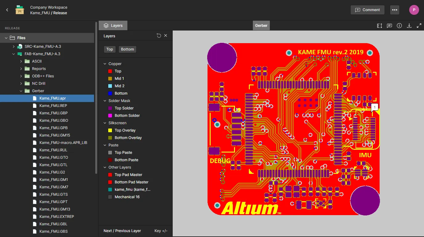 Select any file within the Gerber output list to see a graphical composite of the released Gerber data. Use the Layers menu to view the Gerber data for a specific layer, and the panel options on the upper right to access the Gerber viewer's measurement, commenting and download features. The viewing of PDF files also is supported – scroll or use the Page dropdown menu to navigate through the PDF pages, and the Information panel on the right (