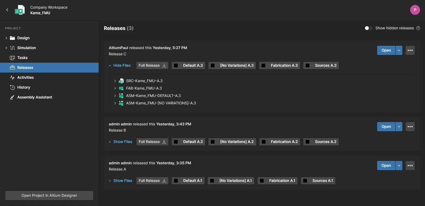 The Releases view presents all project release packages that have been generated from the design space (see Design Project Release), where each package incorporates the released Source, Fabrication and Assembly data.