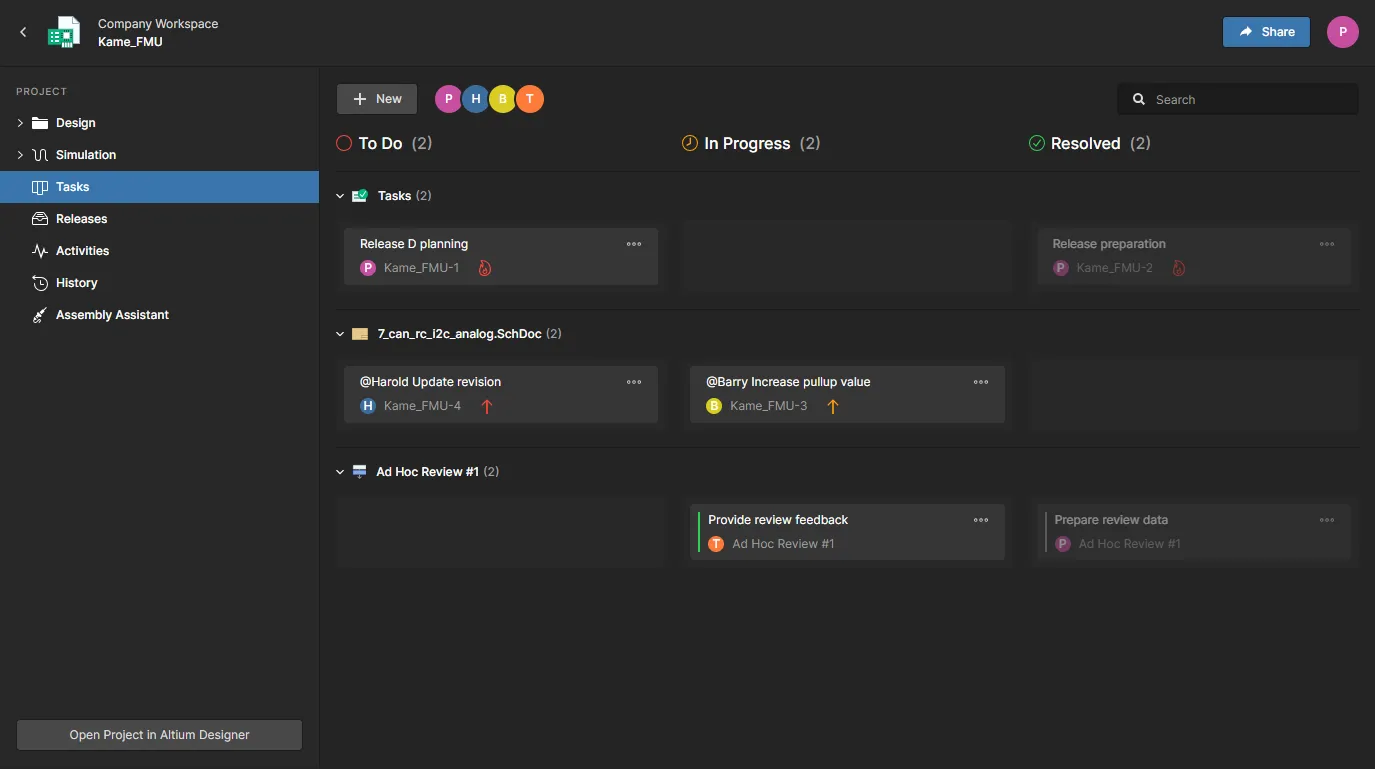 Although presented through a relatively simple interface, the Workspace Tasks dashboard offers a flexible and efficient way of both managing and tracking work progress within the actual design environment rather than via an external system. This page is a project-specific view of Tasks that are currently active for the open Workspace project, while the global Tasks view available from the main Workspace navigation tree represents Tasks that are active for all projects in the Workspace.