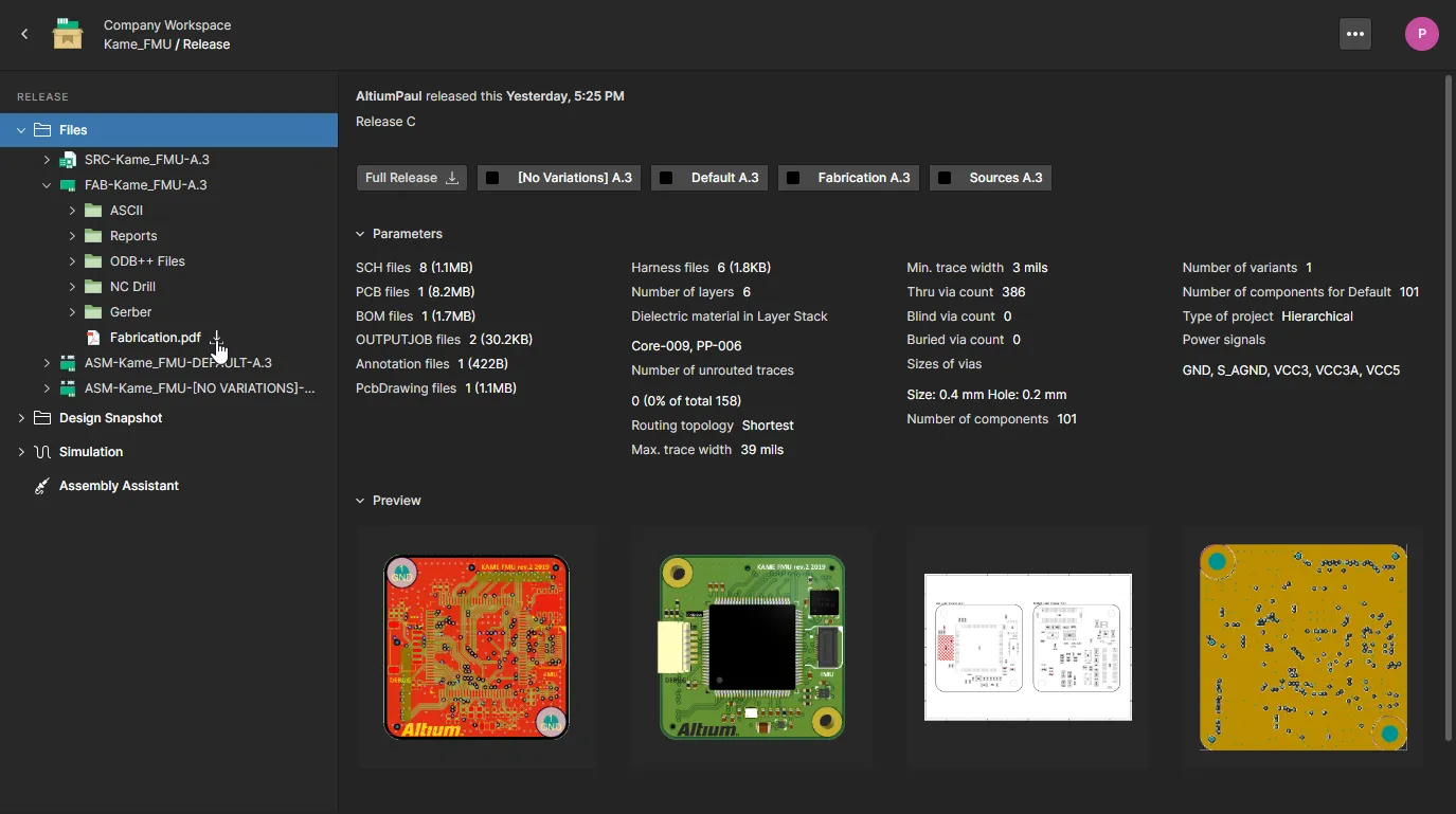 Expand the tree on the left to view the data sets involved in this release and the data each contains. For the design source, this is the snapshot of the design with all source files used in the release of this particular package. For the fabrication and assembly data sets, this will be the output manufacturing data generated as part of the release. Download is supported at all levels of granularity – from the whole data set, to a particular folder/type of output, down to the individual file level. Hover over an entry and click