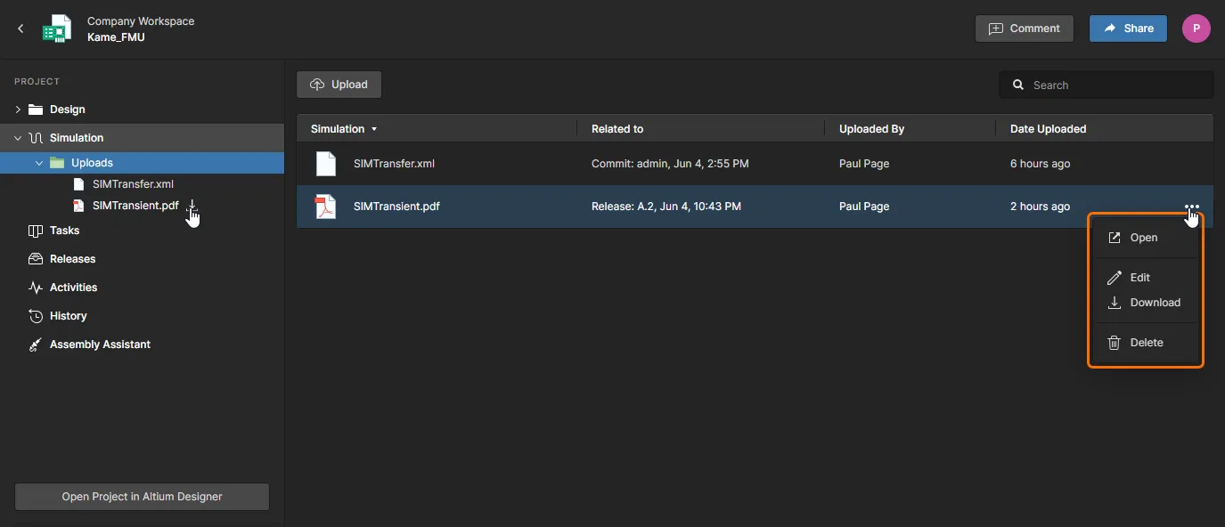 Simulation – upload simulation results files to the current project, which are then available for inspection or downloading by all users who have access to the project.