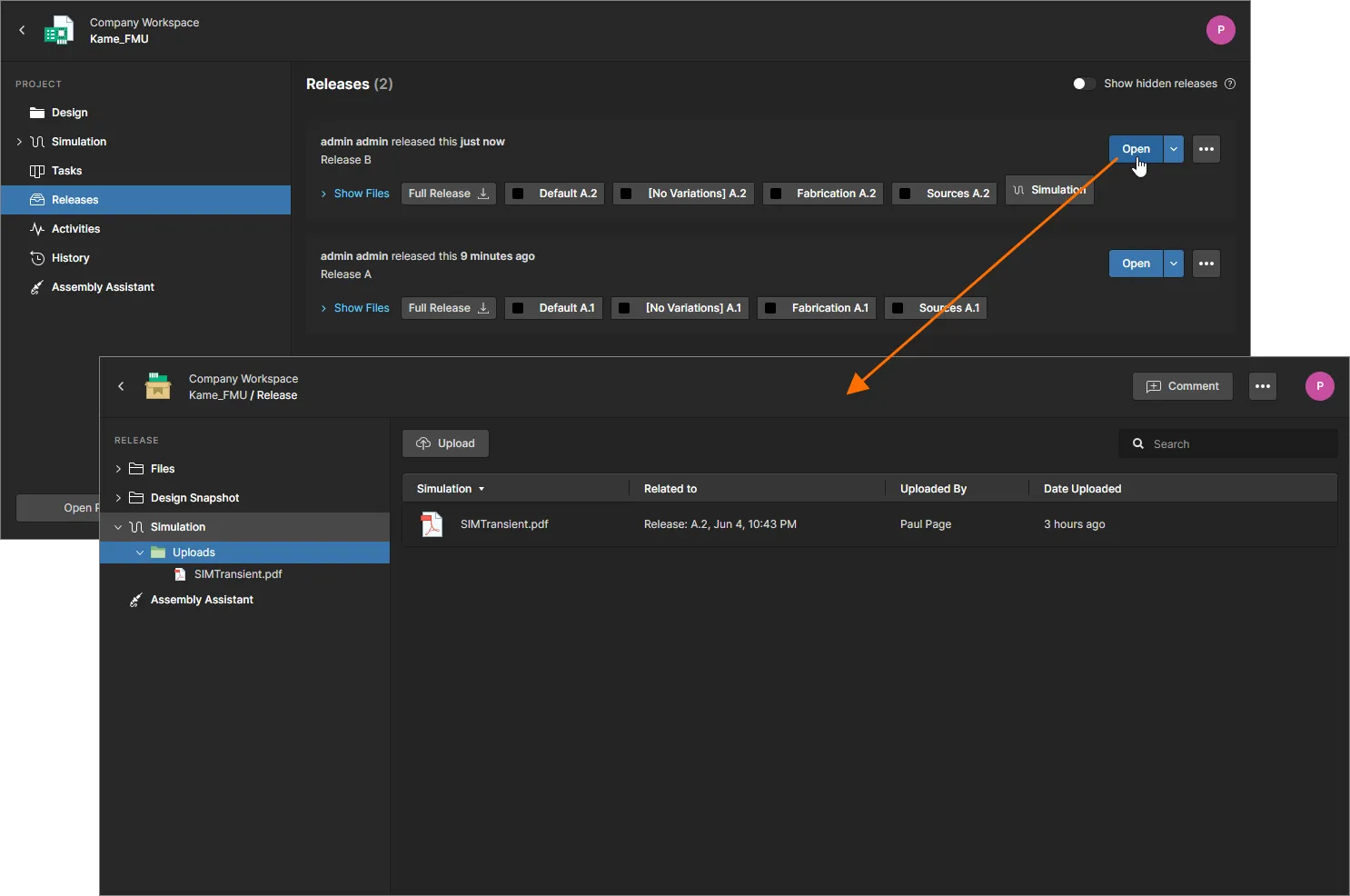 Back on the main Simulation page, all uploaded files that have been added to the current project – including those uploaded to a project Release – are included in the Uploads list.