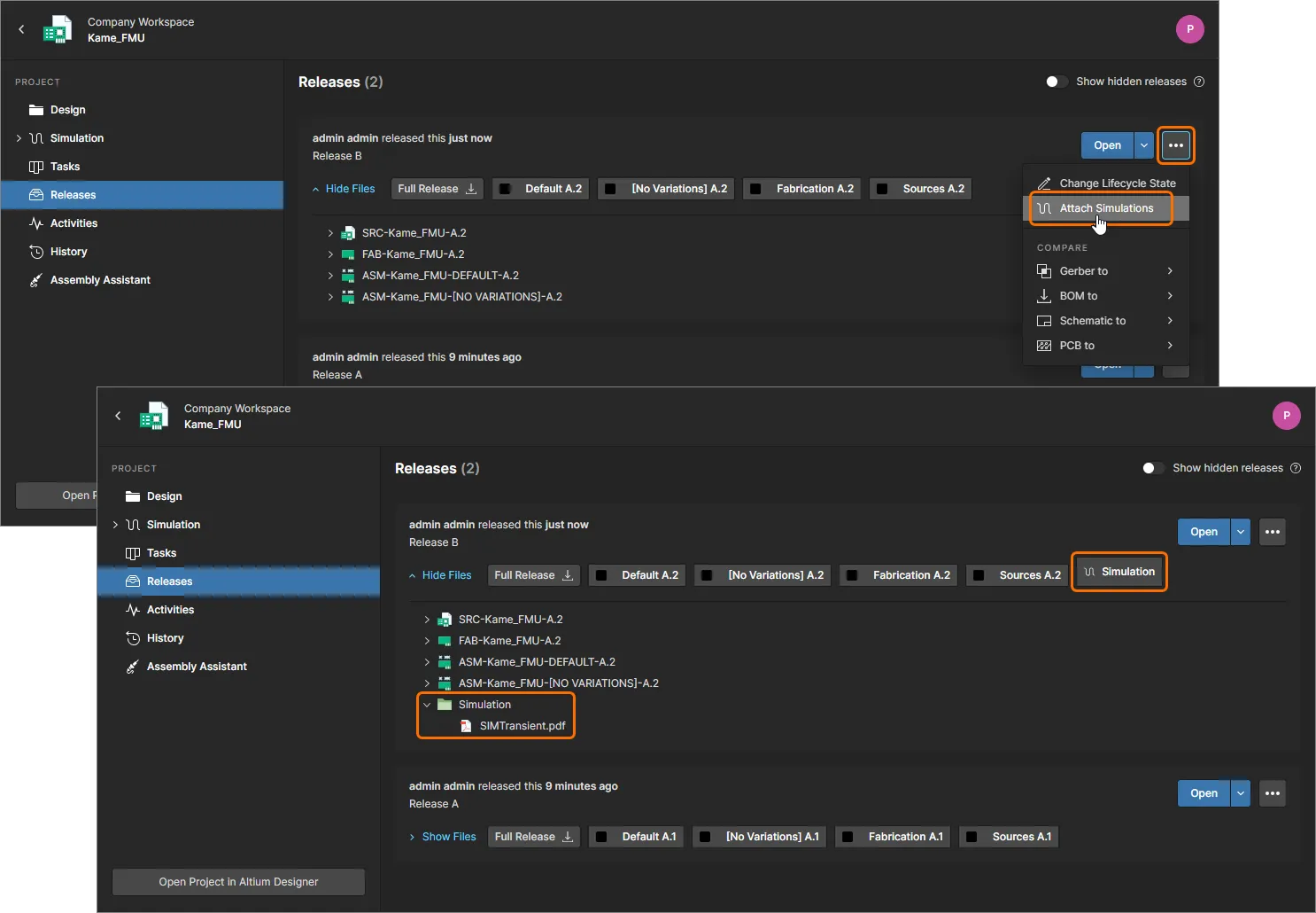 Files also can be uploaded to a specific Project Release through the Workspace Releases page, in this case by using the Attach Simulations option from a Release entry's