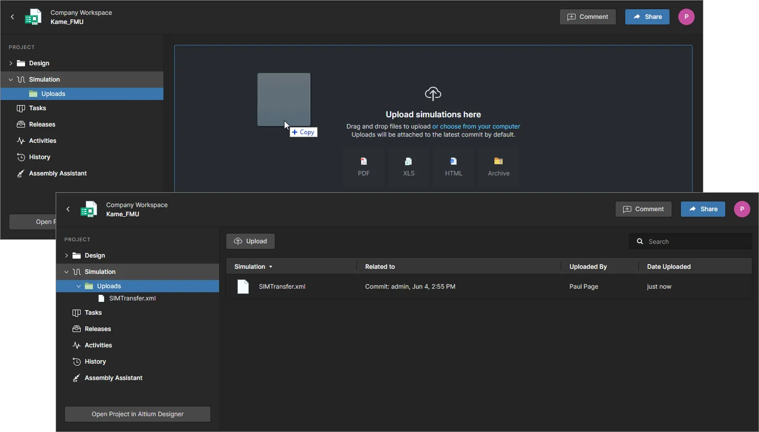 Upload Simulation results to a project in a range of file formats, for access by Workspace members.
