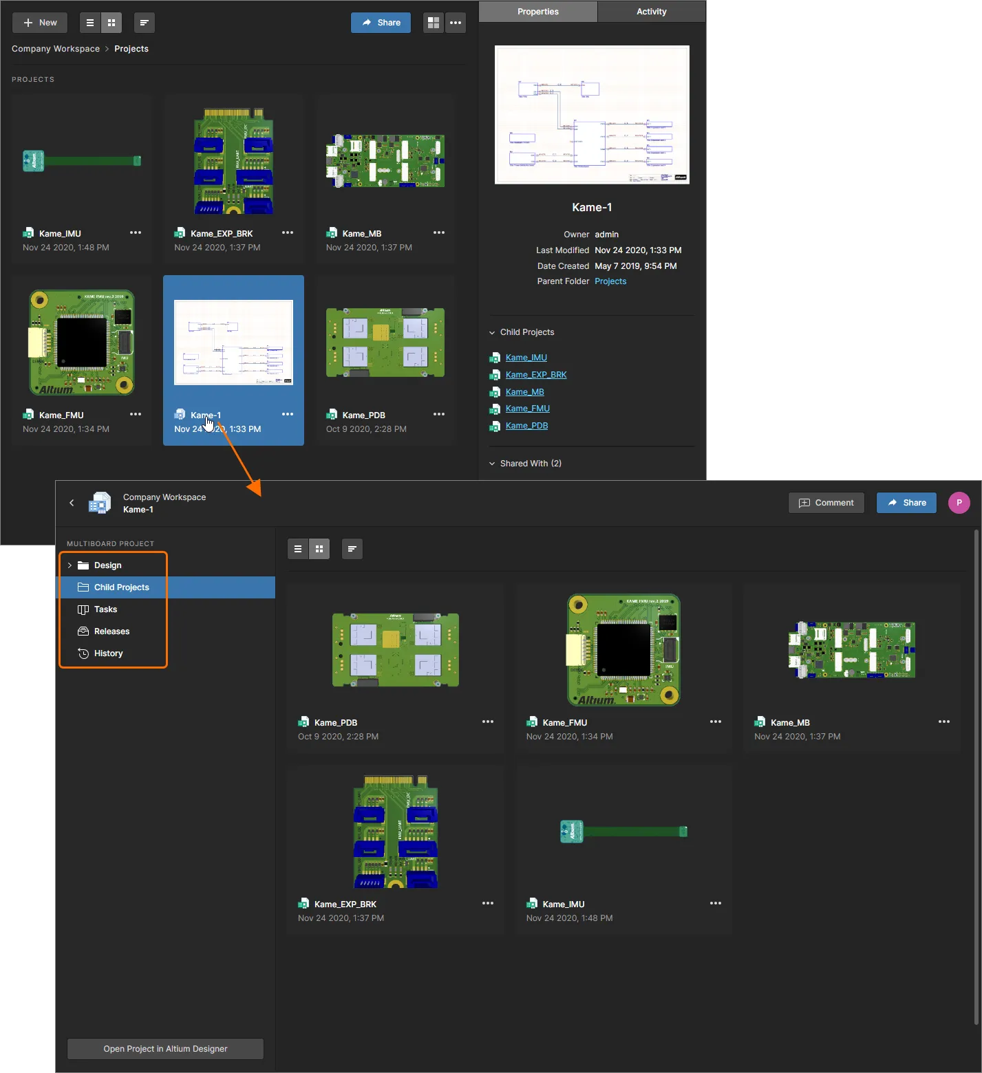 Child Projects view – includes individual project designs that are incorporated within the Multi-board project (its sub-modules). Each of the included sub-projects can be opened individually as normal.