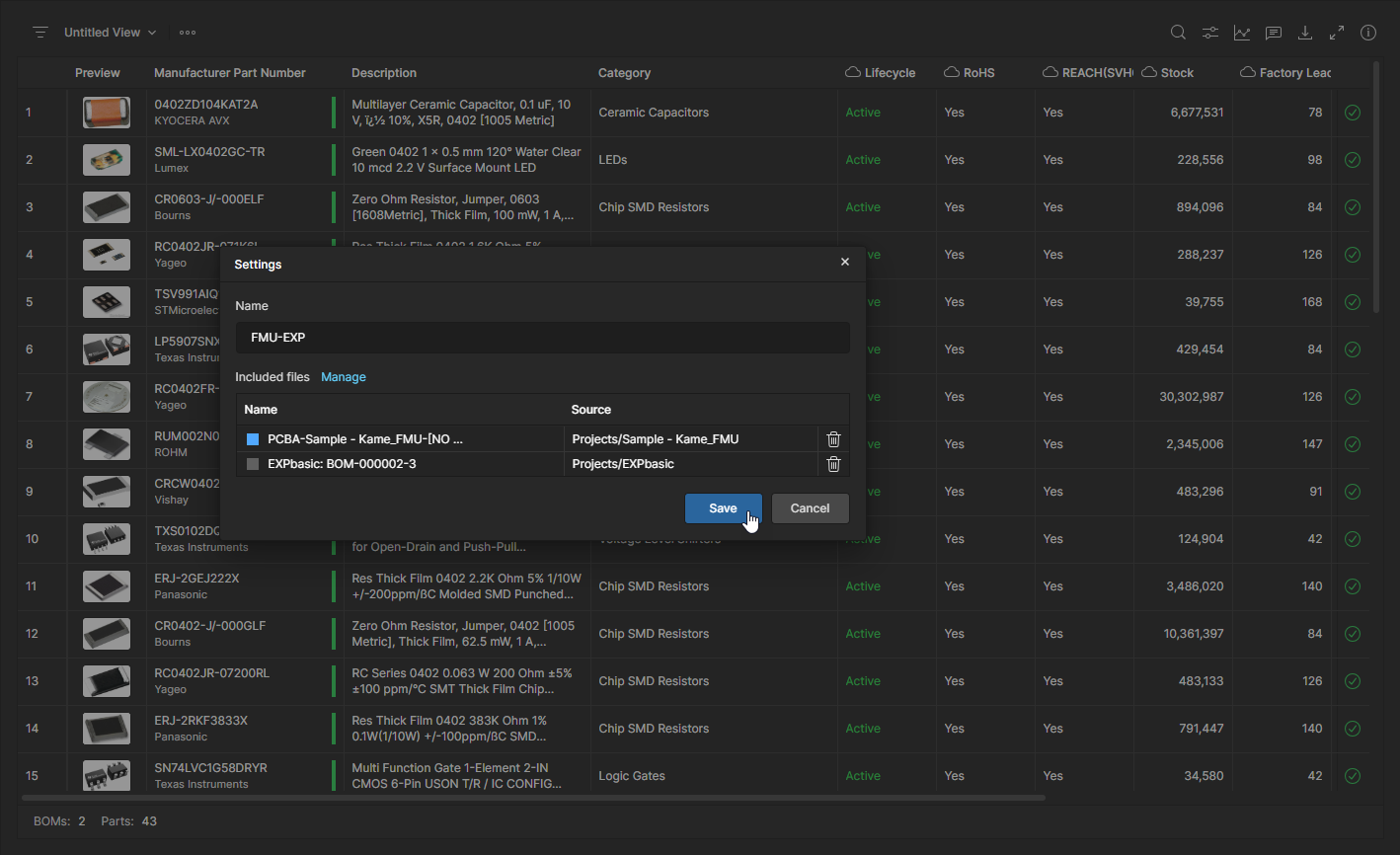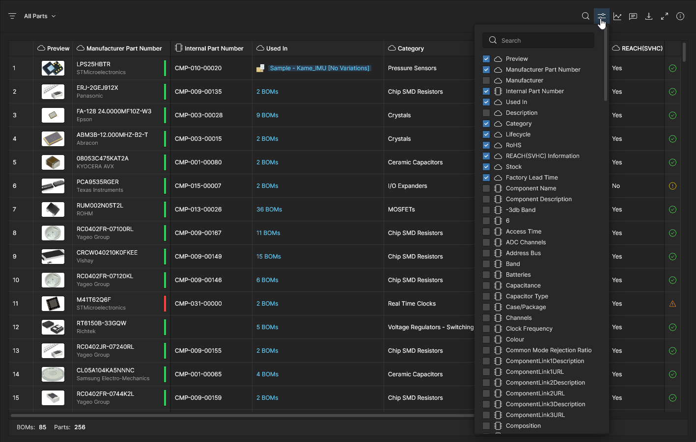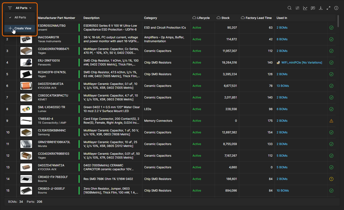 기본적으로 모든 Workspace Project 및 Managed BOM 소스가 목록에 포함되며, 이는 목록 위의 뷰 옵션 메뉴(All Parts)에 표시됩니다. 이 메뉴를 선택해 다른 사용 가능한 뷰를 선택하거나, Create View 옵션을 선택해 Select BOMs to Include in the View 대화상자에서 새로운 BOM 데이터 소스 세트를 선택할 수 있습니다.