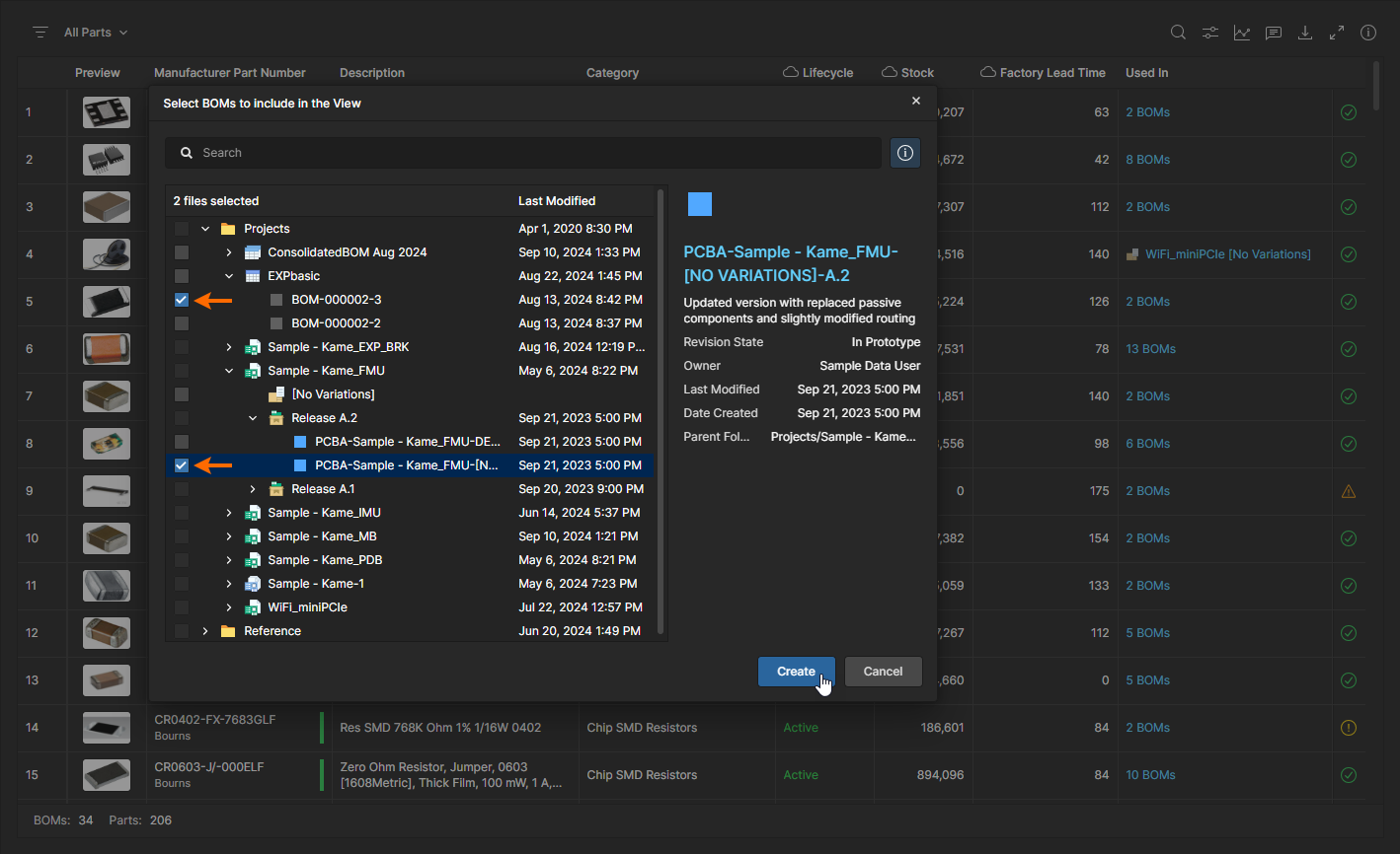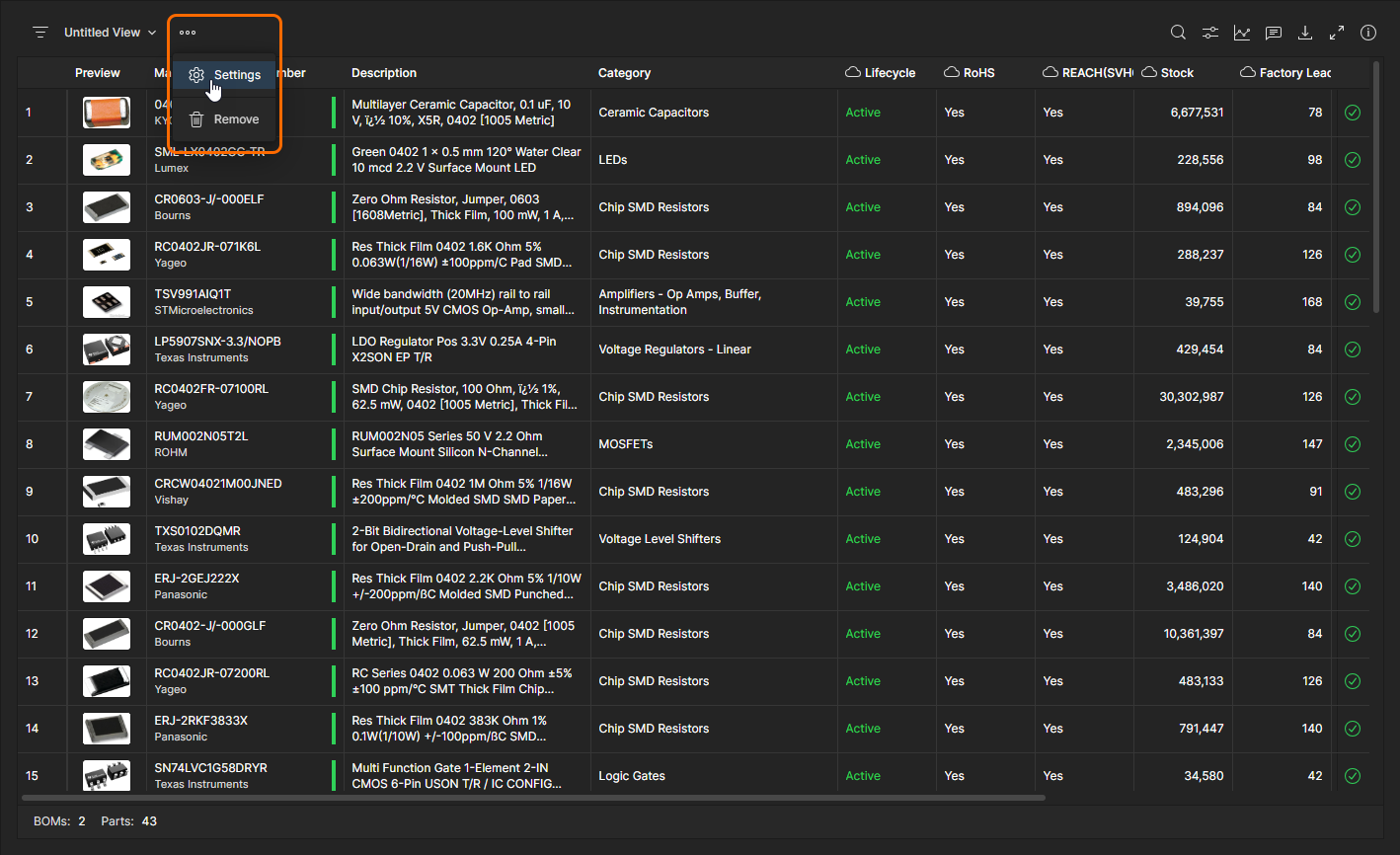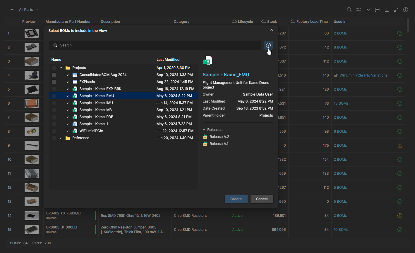 기본적으로 모든 Workspace Project 및 Managed BOM 소스가 목록에 포함되며, 이는 목록 위의 뷰 옵션 메뉴(All Parts)에 표시됩니다. 이 메뉴를 선택해 다른 사용 가능한 뷰를 선택하거나, Create View 옵션을 선택해 Select BOMs to Include in the View 대화상자에서 새로운 BOM 데이터 소스 세트를 선택할 수 있습니다.