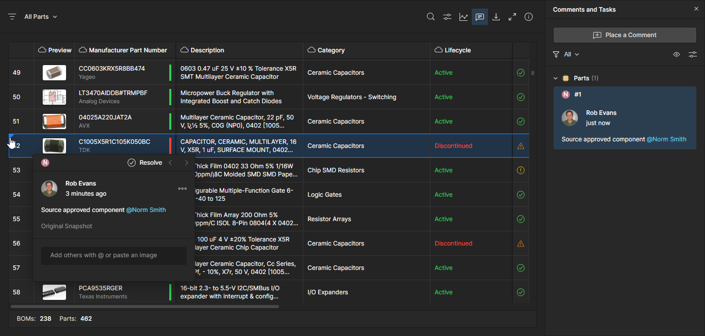 부품이 단일 BOM 엔터티에서 사용되는 경우, 이름 위에 마우스를 올리면 관련 부품 Designator를 볼 수 있습니다. 항목을 클릭하면 소스가 새 브라우저 탭에서 열립니다.