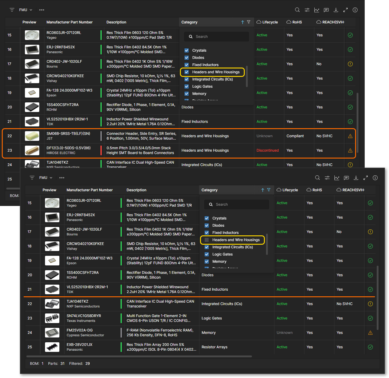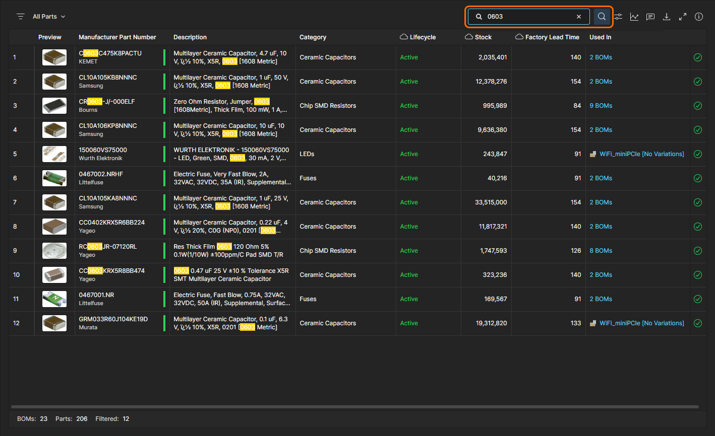 아이콘으로 열고(또는 닫는) Search 필드에 입력한 키워드를 포함하는 항목으로 부품 목록을 제한합니다. 검색은 대소문자를 구분하지 않으며, 모든 부품 파라미터 열( Used in제외)을 대상으로 하고, 목록 결과에서 검색어를 하이라이트 표시합니다.