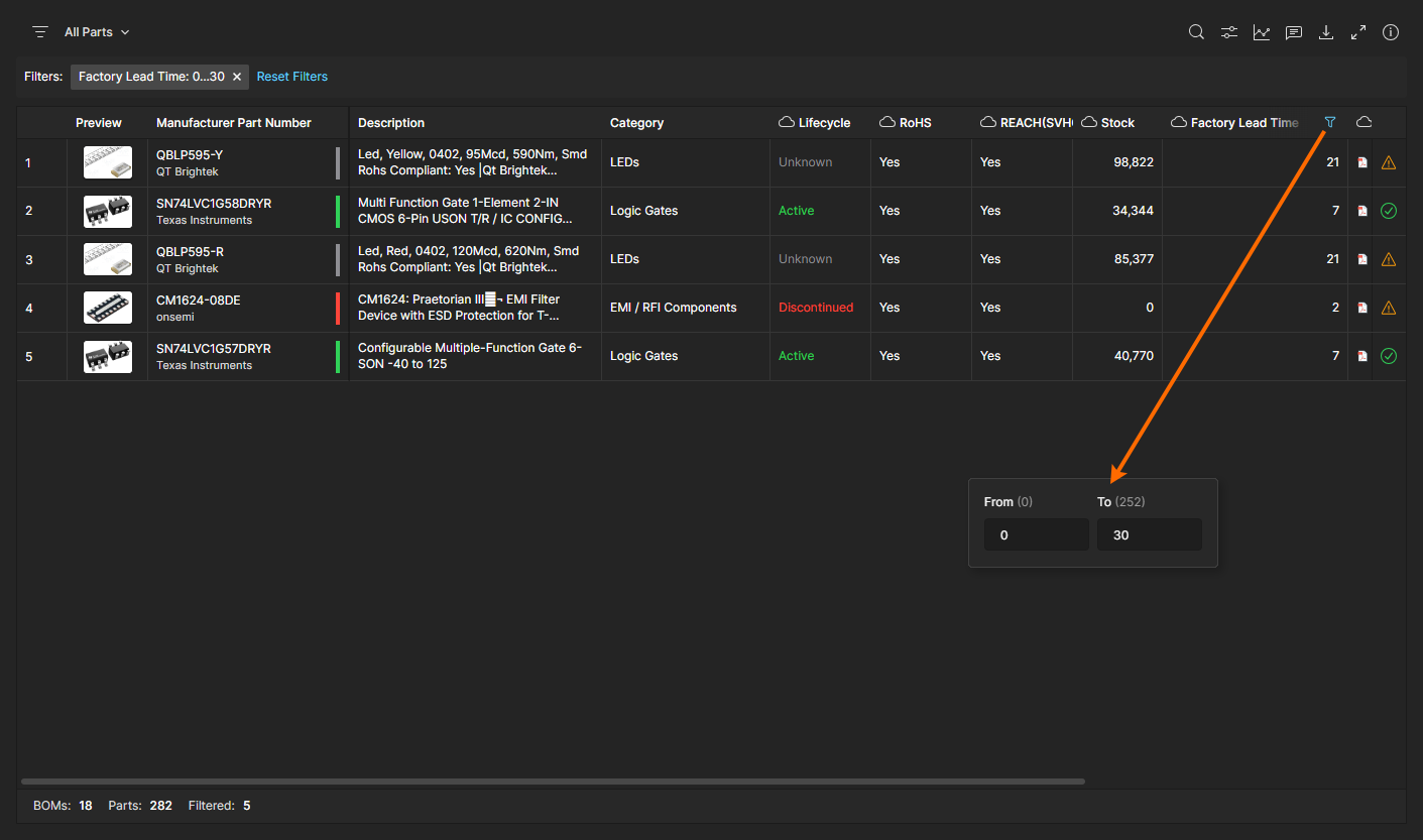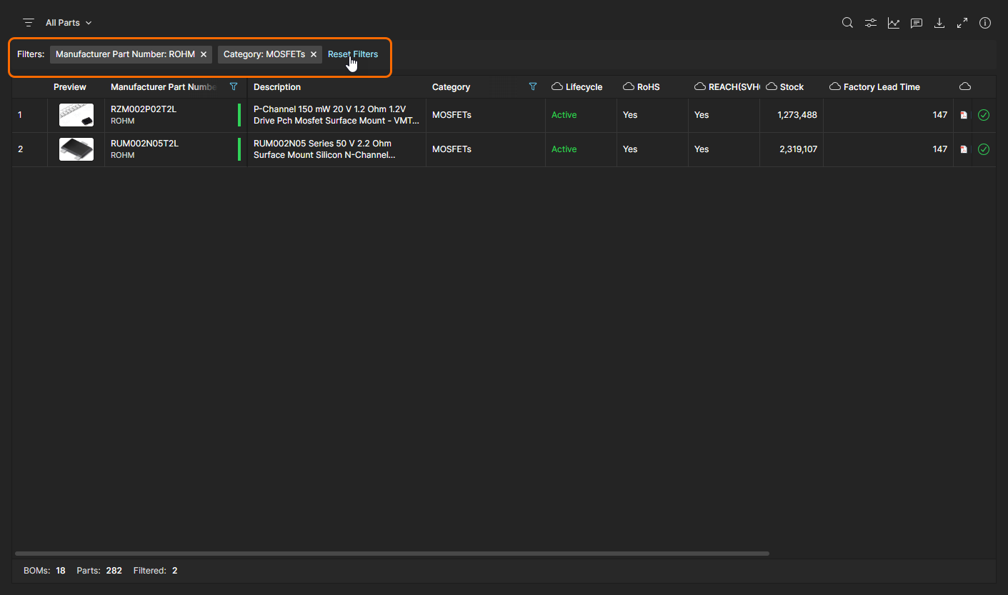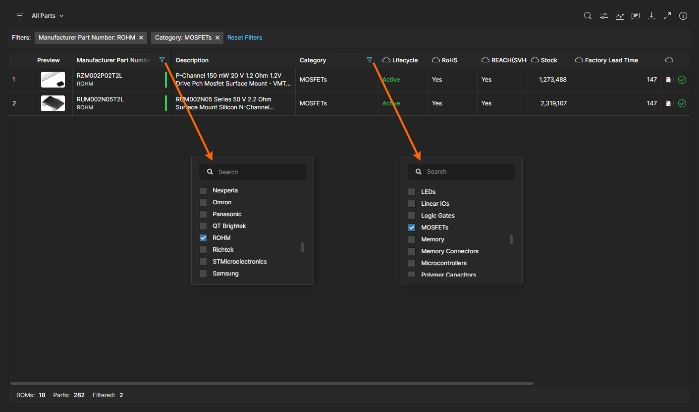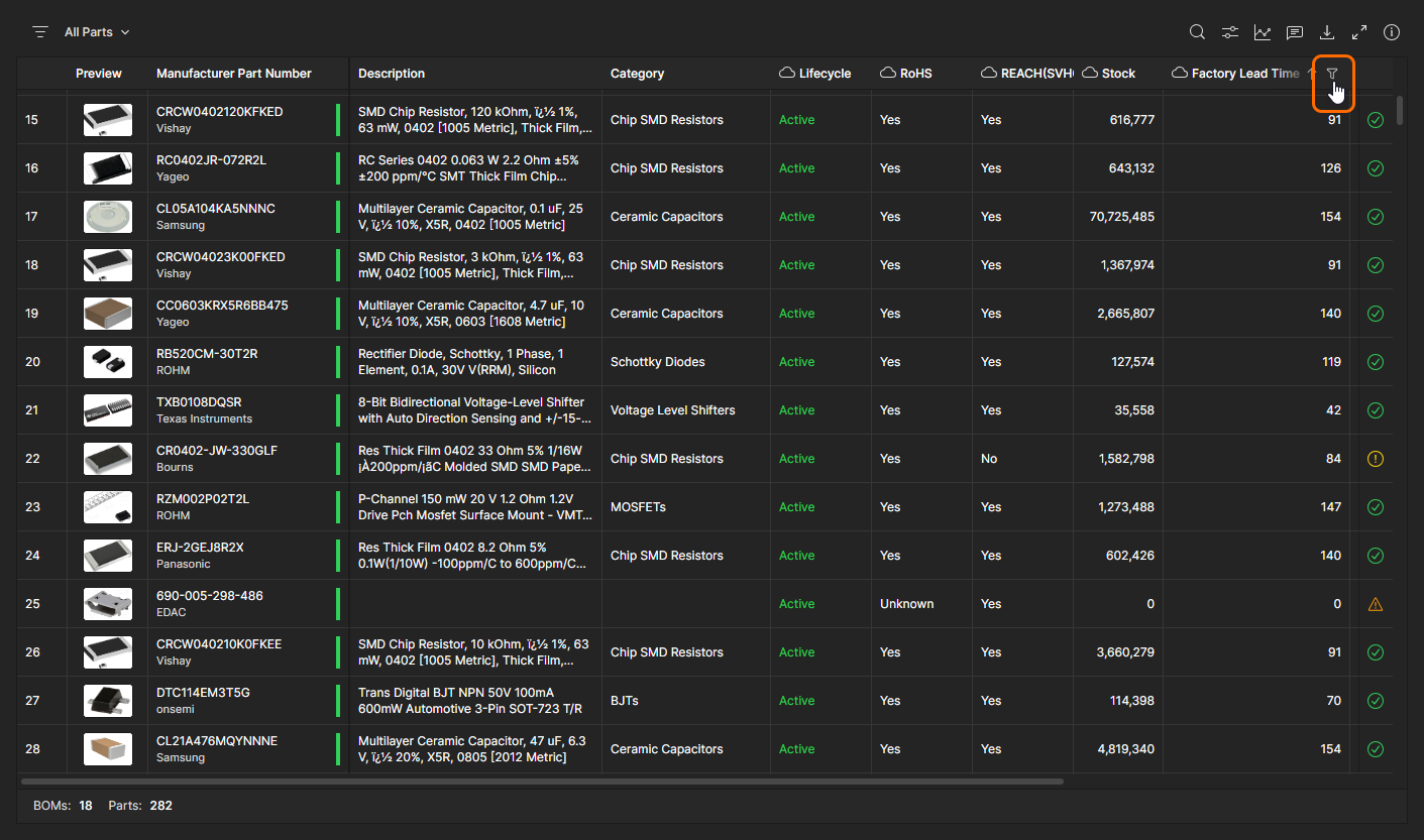 Column Filters – 열 Filters에서 설정한 특정 파라미터 데이터 요구사항을 만족하는 항목으로 부품 목록을 제한합니다. 필터는 열 헤더의