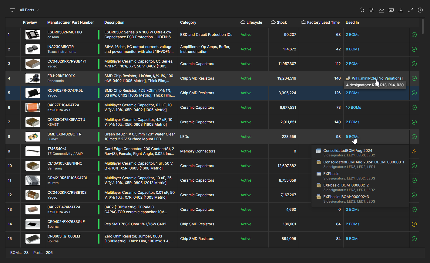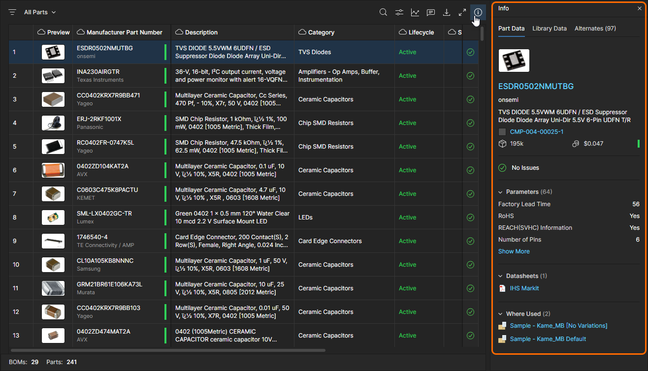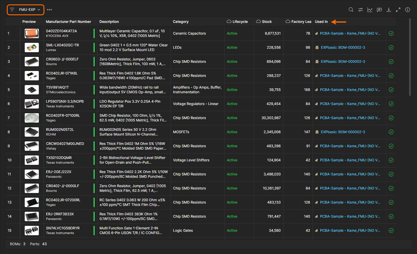 목록의 Used In 열에는 해당 부품이 현재 사용 중인 관련 BOM 소스 이름이 포함됩니다. 여기에는 Design Projects 또는 Managed BOMs, 혹은 그 Release에서의 사용이 포함됩니다: