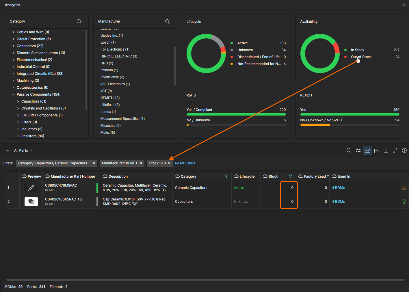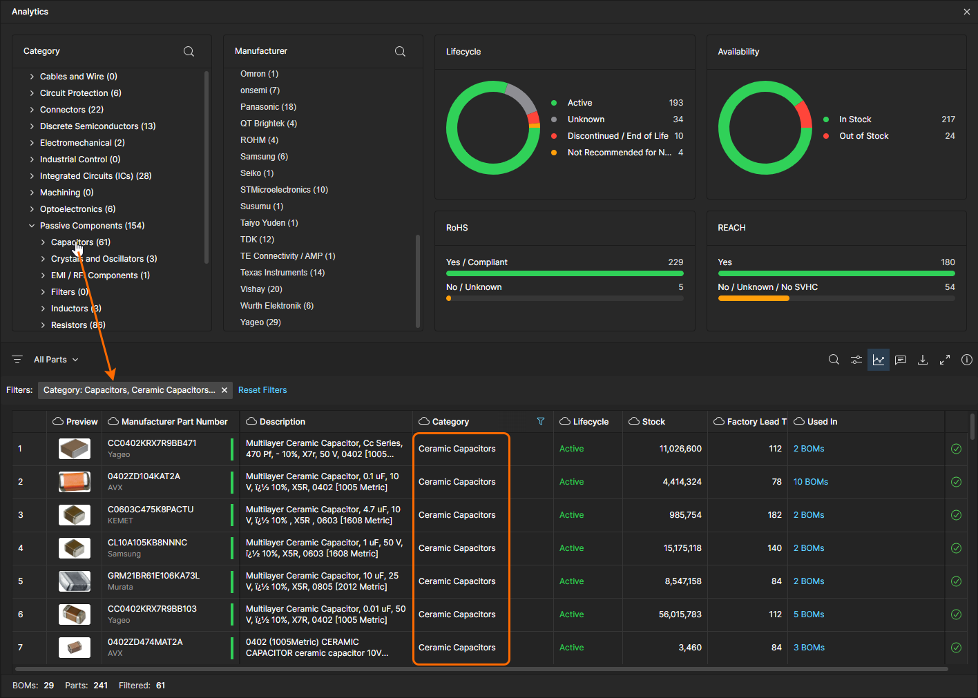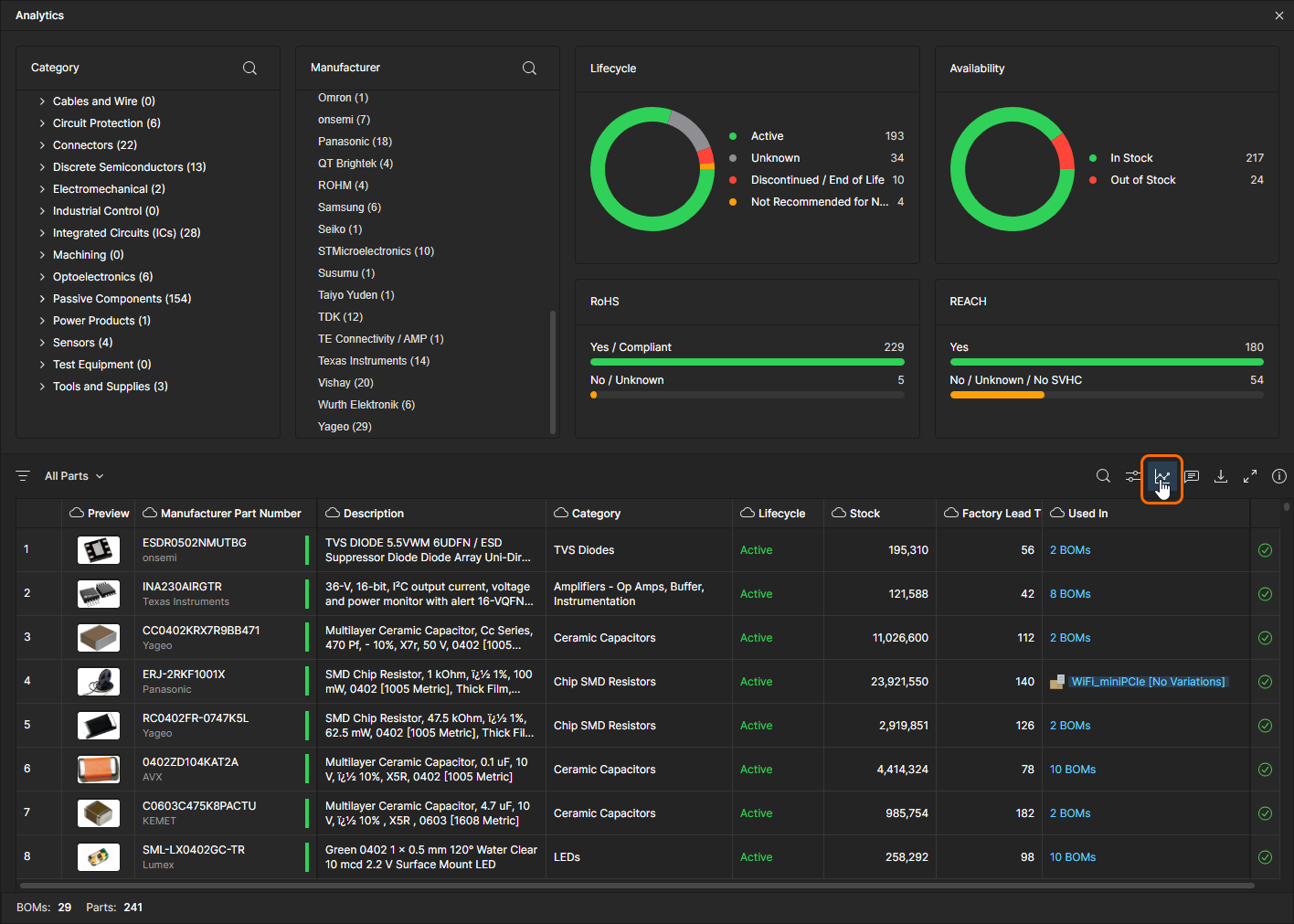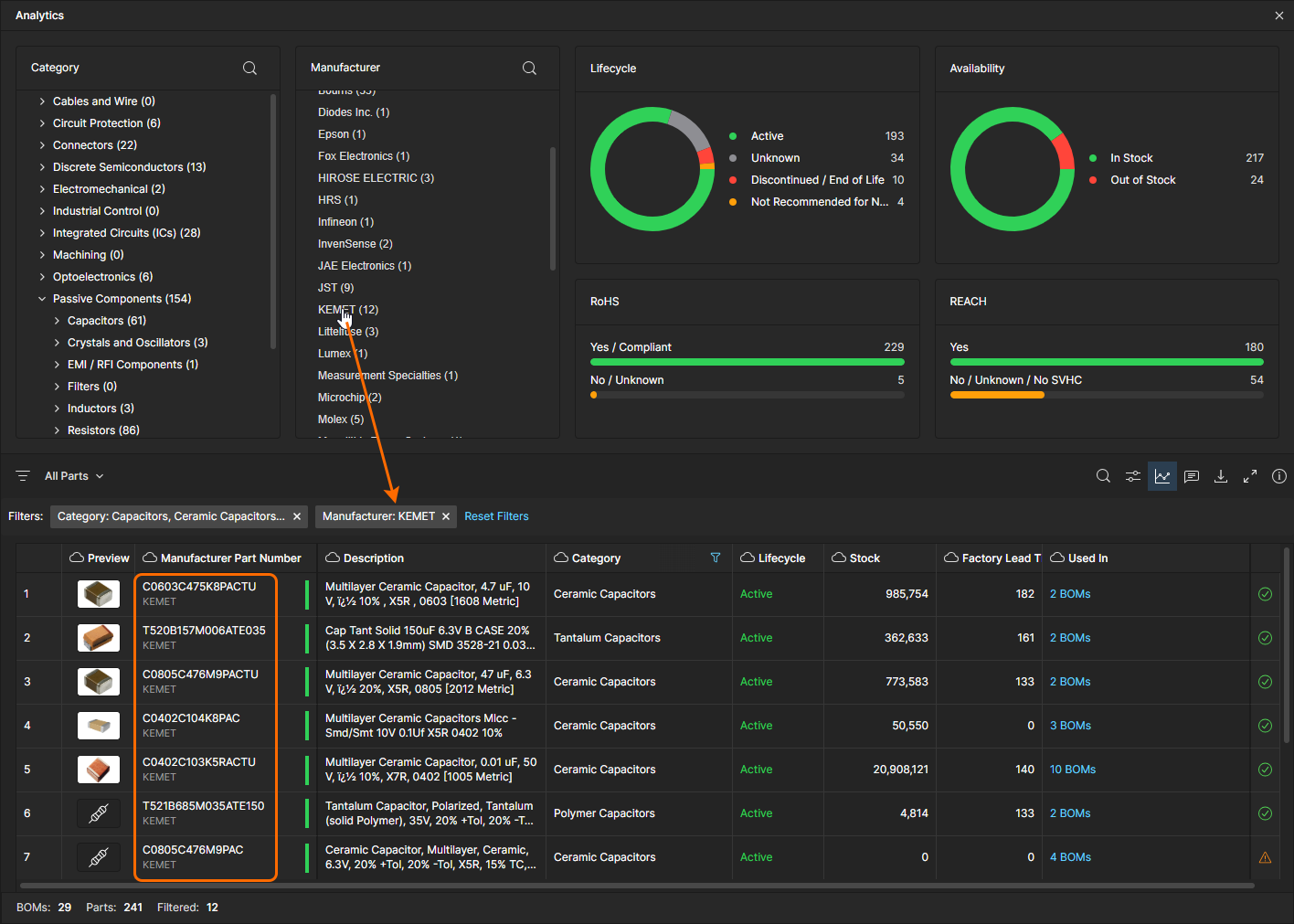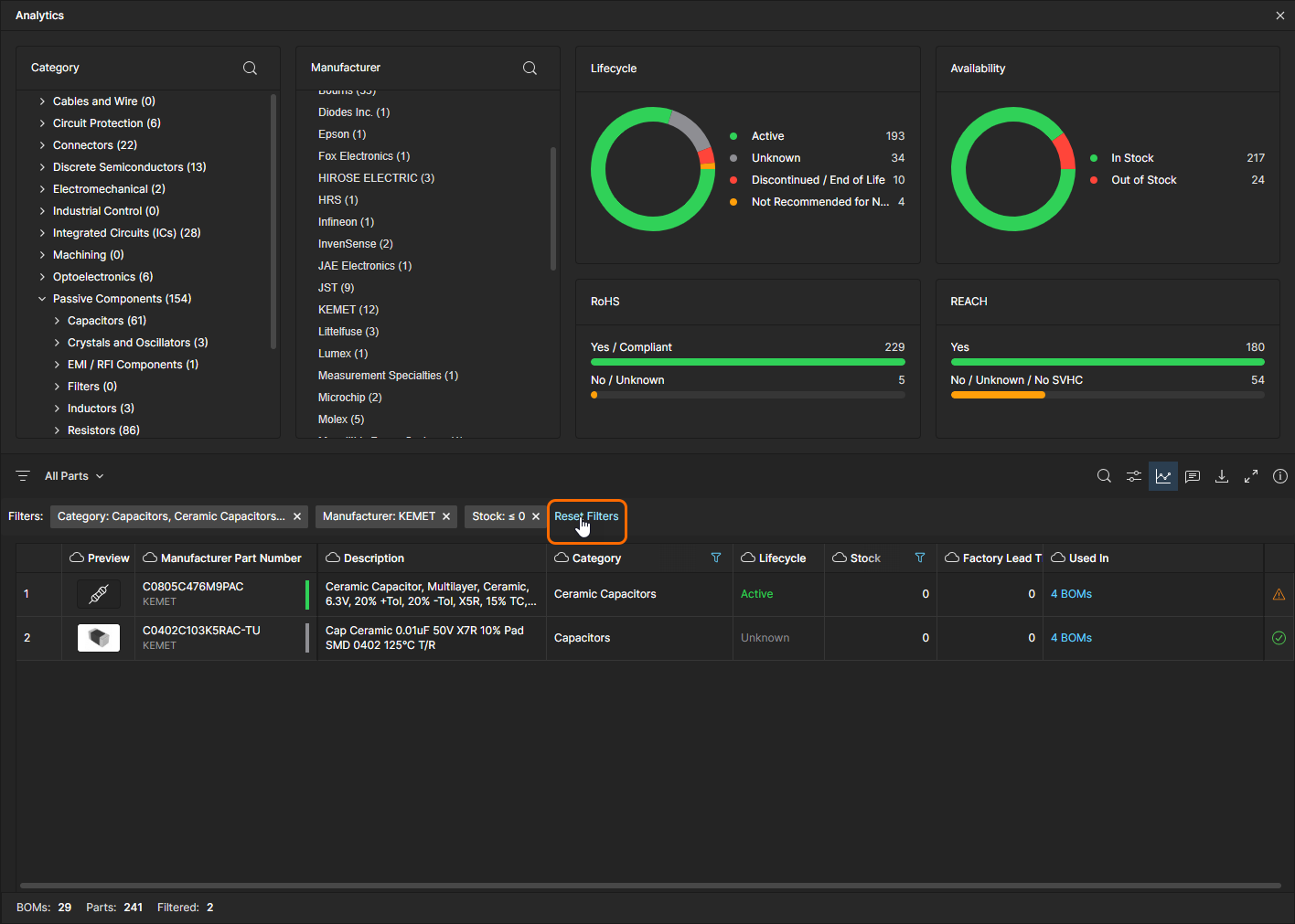 Analytics 데이터는 Parts in Use 목록과도 상호작용하여 콘텐츠를 필터링합니다. 특정 컴포넌트 Category (Component Type) 또는 부품 Manufacturer을 선택해 목록을 일치 항목으로 제한하거나, 파이 그래프의 섹션/라벨 또는 막대 그래프 항목을 클릭해 해당 파라미터 데이터와 일치하는 항목으로 목록을 필터링할 수 있습니다. 여러 필터를 동시에 적용할 수 있으며(AND 관계), 파라미터 필터는 다시 클릭하거나, 목록 위의 Filters 영역에서 해당 항목을 닫거나, Reset Filters 옵션으로 적용된 모든 필터를 제거하여 해제할 수 있습니다.