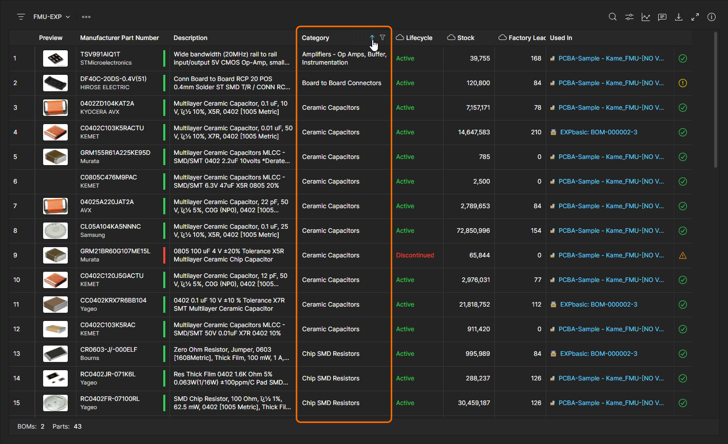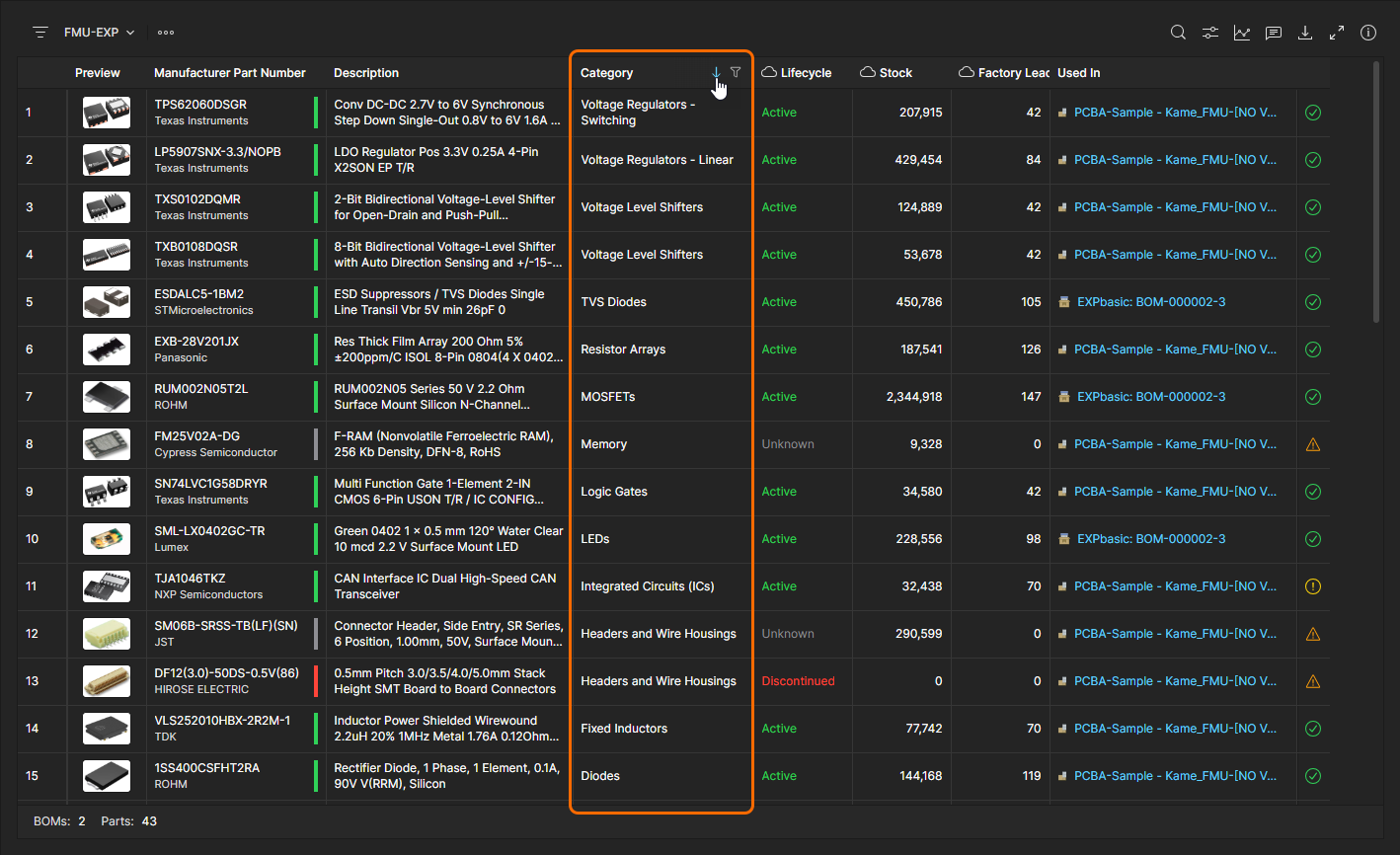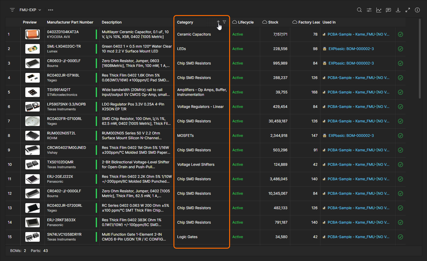 기본 부품 데이터 열 세트와 함께, Parts in Use 목록에는 정렬을 돕기 위한 컴포넌트 타입 Category 같은 특수 열( below 참조)과, 해당되는 경우 연관된 Library Component의 Internal Part Number도 포함됩니다. Column Display Preferences 옵션을 사용해 표시되는 파라미터 열을 구성하고 순서를 지정할 수 있습니다