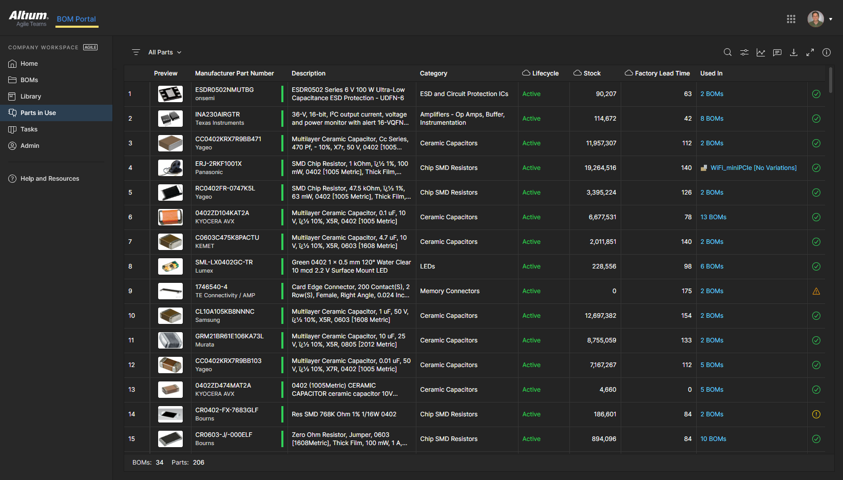 BOM Portal의 Parts in Use 페이지는 현재 Workspace Projects 및 Managed BOMs에서 사용 중인 모든 제조사 부품에 대한 통합 개요를 제공합니다. 목록에는 각 제조사 부품 항목별로 주요 파라미터 열(가능한 경우 SiliconExpert parameters 같은 외부 소스 포함)이 채워지며, 참조된 BOM 문서로 연결되는 활성 Used In 링크도 포함됩니다. 이 페이지를 통해 설계 BOM에 적용된 모든 제조사 부품 참조(컴포넌트 Part Choices)를 빠르게 확인하는 동시에, 부적절한 Lifecycle, 표준 미준수, 과도하게 긴 제조 리드타임 등 현재의 이슈가 있는지 점검할 수 있습니다. 또한 현재 보고서 뷰는 다운로드 기능을 사용해 CSV 파일로 저장할 수 있습니다.