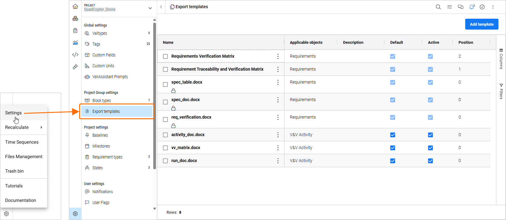 Templates available to your Requirements Portal instance are listed on the Export templates page ( » Settings » Export templates).