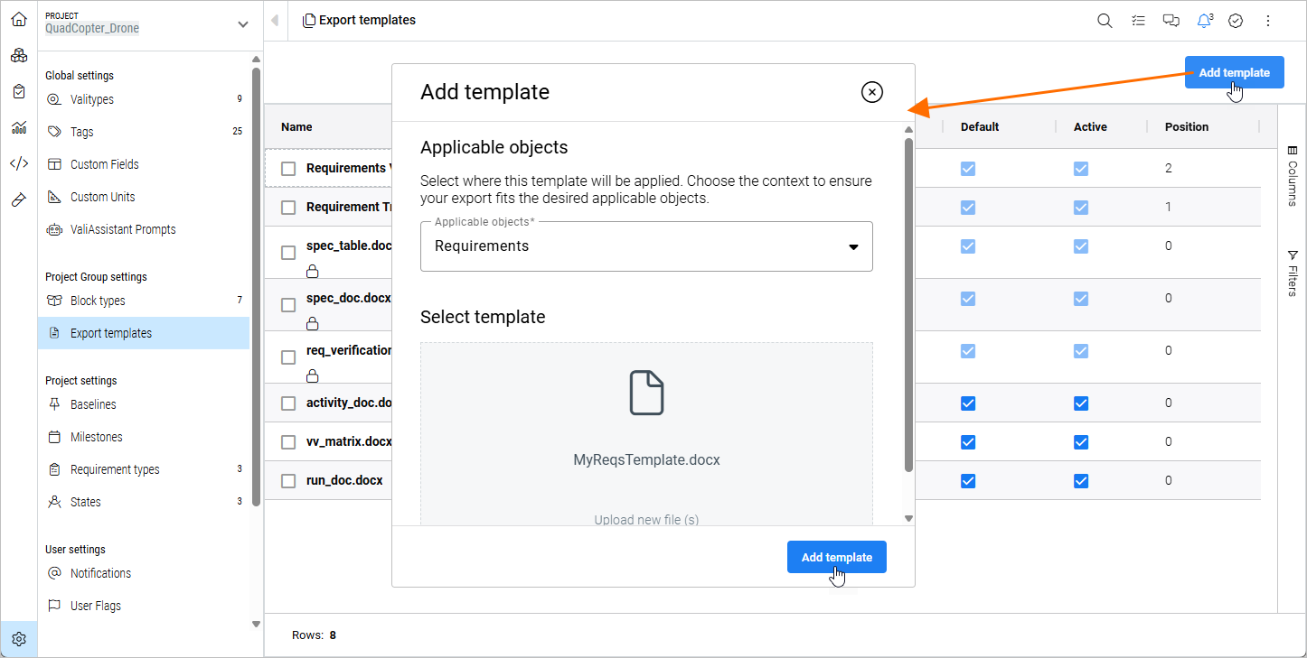 To add a new user-defined template, click the button at the top right of the page. In the Add template window that appears, choose if the new template needs to be applied to Requirements or V&V Activities using the Applicable objects drop-down and then use the Select template region to select the template file.