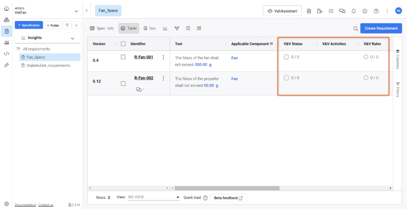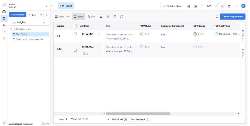 "만들기"를 클릭한 후 "저장"을 클릭하고 창을 닫습니다. 이제 요구 사항과 연결된 하나의 규칙(확인됨)과 총 2/2의 V&V 상태(질량 검사 활동도 이전에 확인되었으므로)가 있는 것을 볼 수 있습니다.