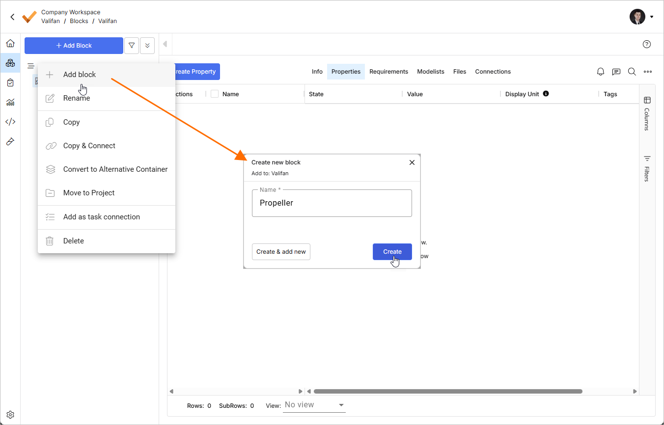 이전 단계에서는 valitype를 추가하는 방법을 보여주었습니다. 그러나 vali(속성)는 질량과 소비 전력에만 제한되지 않습니다. 블록에는 다양한 속성을 추가할 수 있습니다. Requirements & Systems Portal에서는 단위가 있거나 없는 숫자인 새 vali를 만들 수 있습니다. 또한 matrix, textvali(예: 재질), datevali(예: 구매일), datasets(2차원)도 만들 수 있습니다. 어떤 필드에서든 $ 기호를 사용하여 수식에서 valis에 액세스할 수 있습니다.