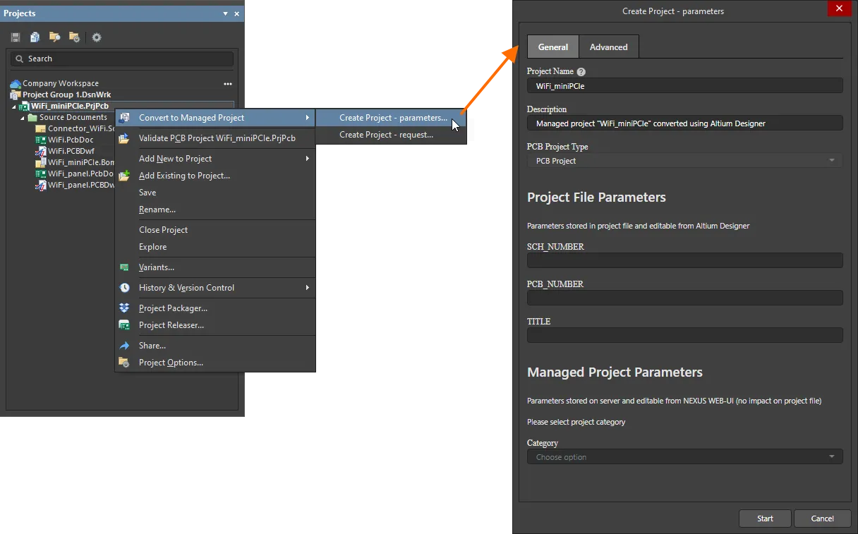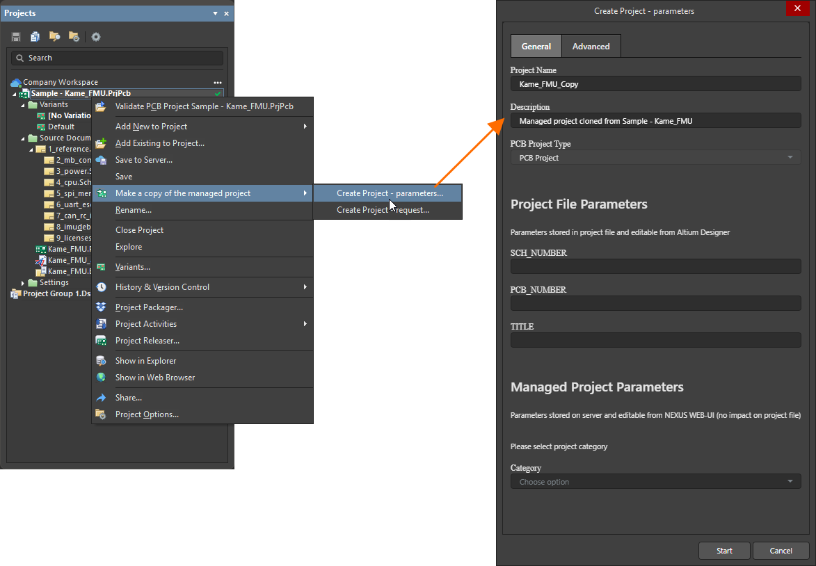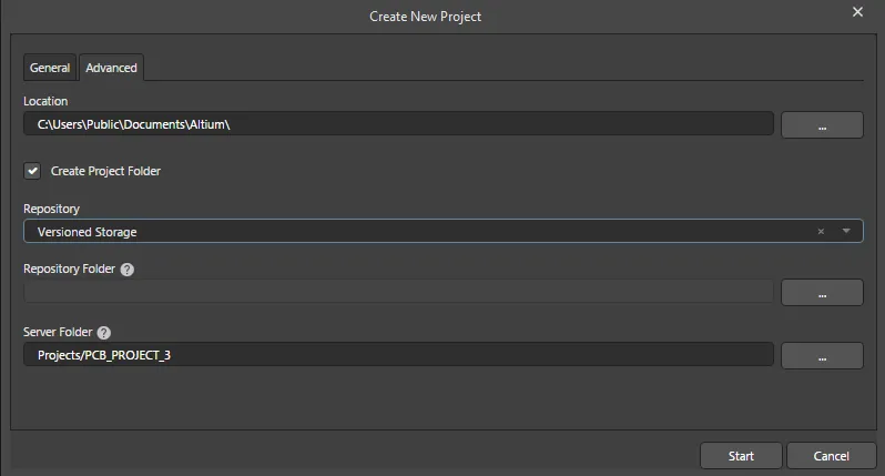 From within Altium Designer, activated process definitions that are part of the Project Creations theme can be accessed from the main File » New » Project in <WorkspaceName> sub-menu. After launching the chosen command, the Create New Project dialog (actually named after the chosen process) opens. Use the General tab of the dialog to give the project a name and description, specify its type, and assign a template, if desired. On the Advanced tab, you can specify the local working directory for the project, choose the target repository and folder and also specify in which folder, within the Workspace's folder structure, it is to reside. Once ready, click Start to create the new Workspace project in accordance with the underlying workflow for that process.