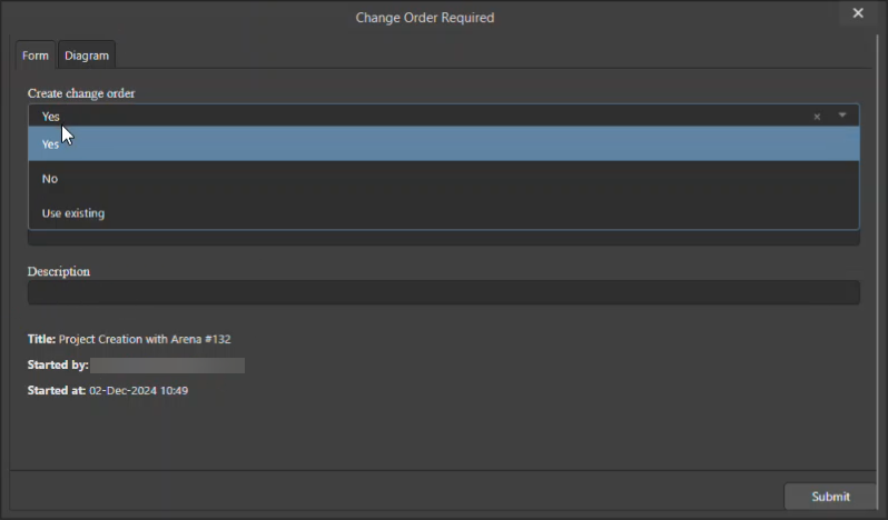 • If the Change Order (ECO) workflow is configured in the PLM interface instance (learn more), an additional Change Order Form will be presented during project creation, where the Change Order's setup and options are specified ().