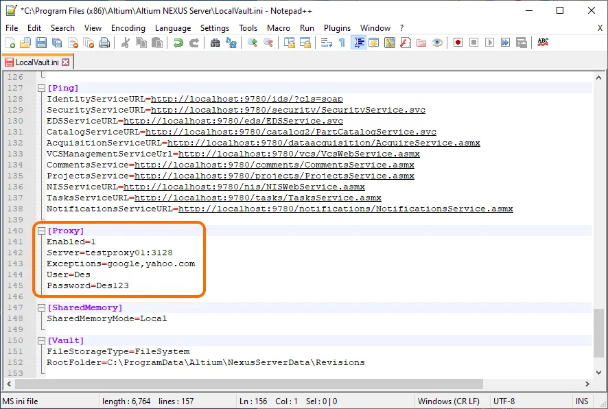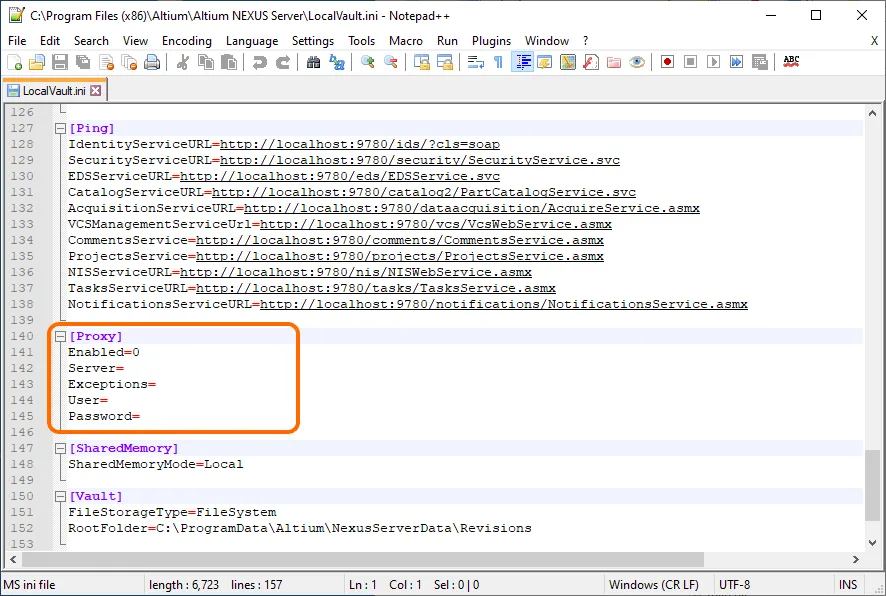 프록시 구성 정보는 [Proxy] 파일의 LocalVault.ini 섹션에 입력합니다. Enterprise Server를 기본 설치한 경우, 이 파일은 다음 위치에서 찾을 수 있습니다: \Program Files (x86)\Altium\Altium NEXUS Server.