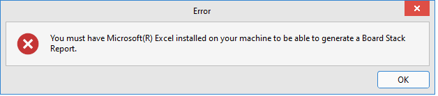 Case1) Board Stack Report를 생성하려면, 컴퓨터에 Microsoft® Excel이 Install되어 있어야 한다는 오류 대화 상자가 나타납니다.
