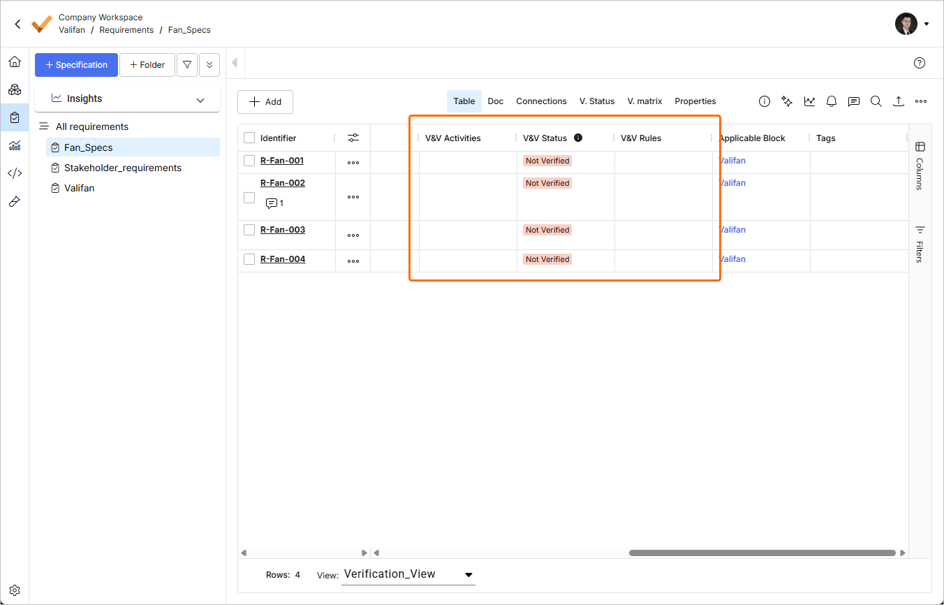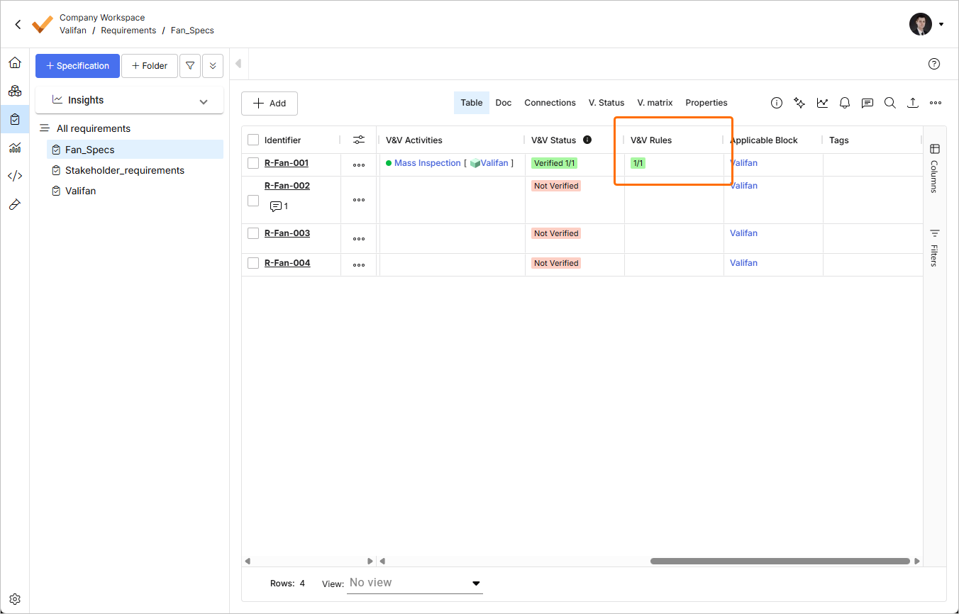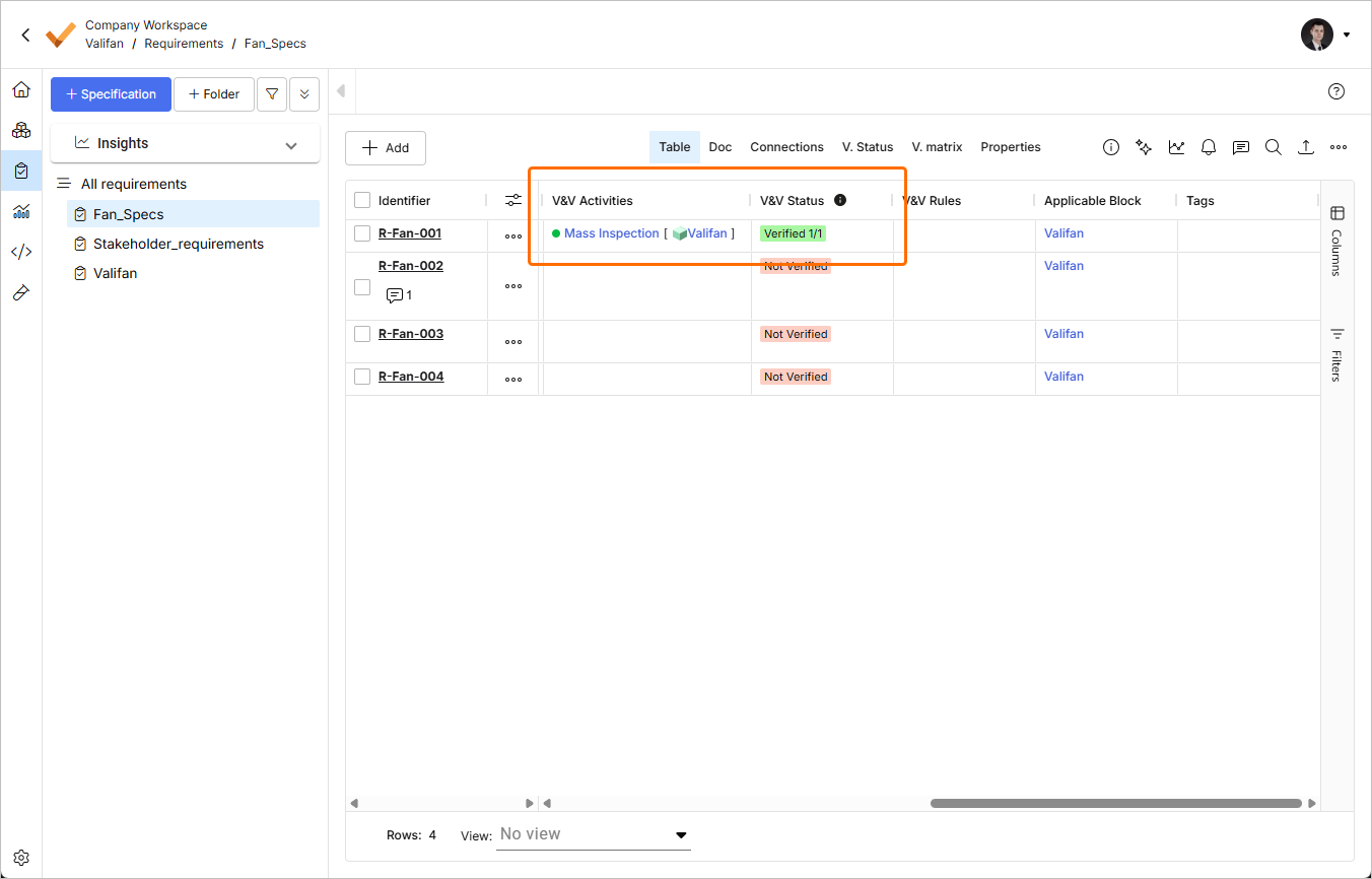 W tabeli zobaczysz przypisane działanie V&V w kolumnie V&V Activities oraz status Verified 1/1 w kolumnie V&V Status.