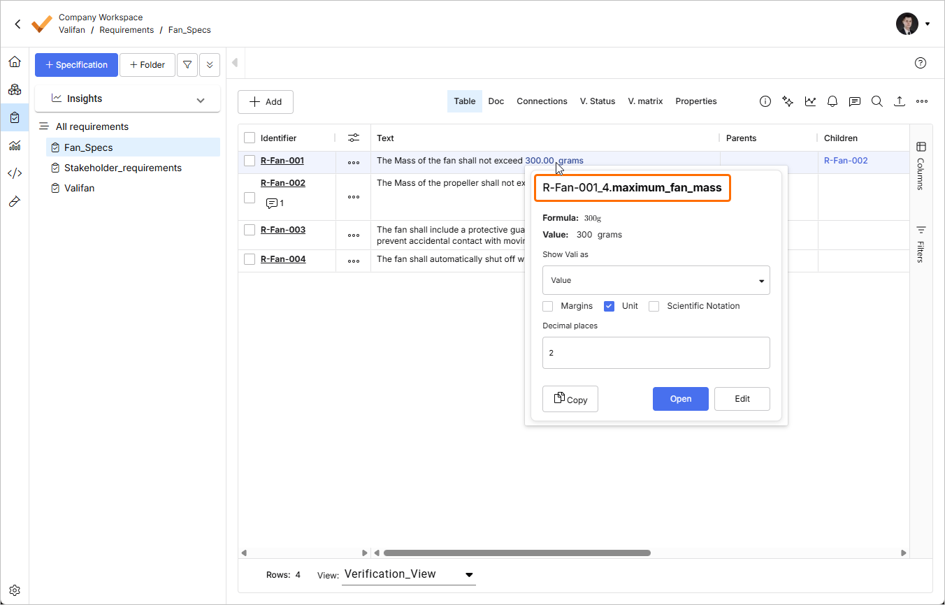 W specyfikacji Fan_Spec najedź kursorem na vali 300 g w kolumnie Text dla wymagania R-Fan-001 i sprawdź jego nazwę w wyskakującym oknie. Ta nazwa zostanie użyta podczas tworzenia reguły, w której ten vali będzie porównywany z vali z modułu System Design.