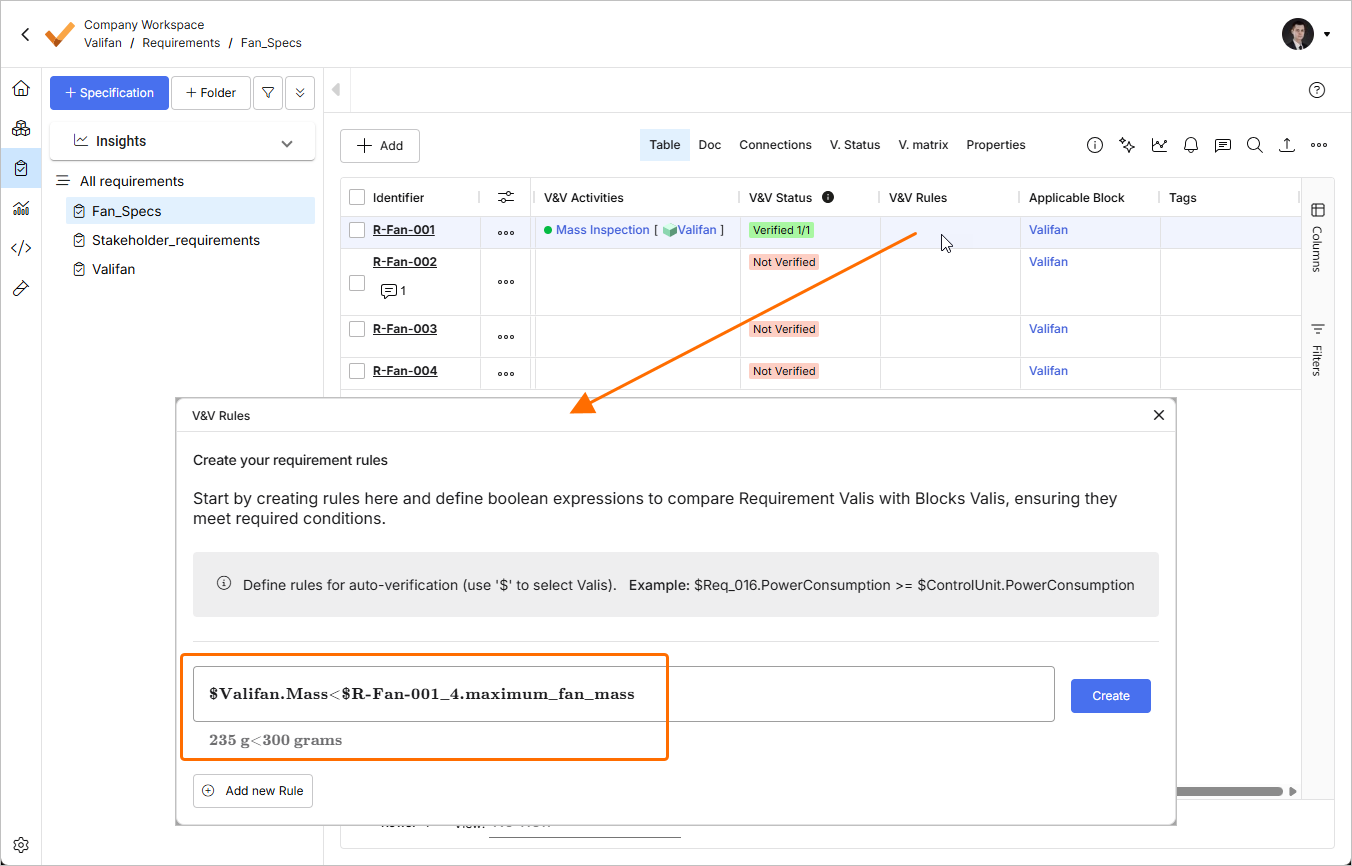 Kliknij dwukrotnie komórkę w kolumnie V&V Rules dla wymagania R-Fan-001 . Otworzy się okno V&V Rules, w którym możesz zdefiniować regułę porównującą nasz wymóg Valifan mass wynoszący 300 g z vali masy systemu Fan z modułu System Design. Użyj symbolu