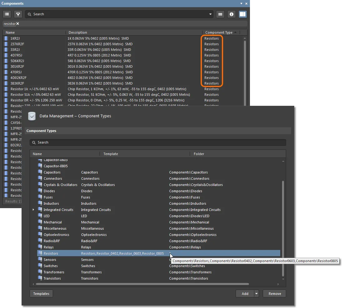Following the merge, the Data Management – Component Types page now indicates that the Resistors component type is the default for multiple Templates – namely, the Resistors Template and all those associated with the newly merged component types (the Resistor_0402 Template, and so on). The Folder entry for the Resistors component type corresponds to the target folders of those multiple templates.