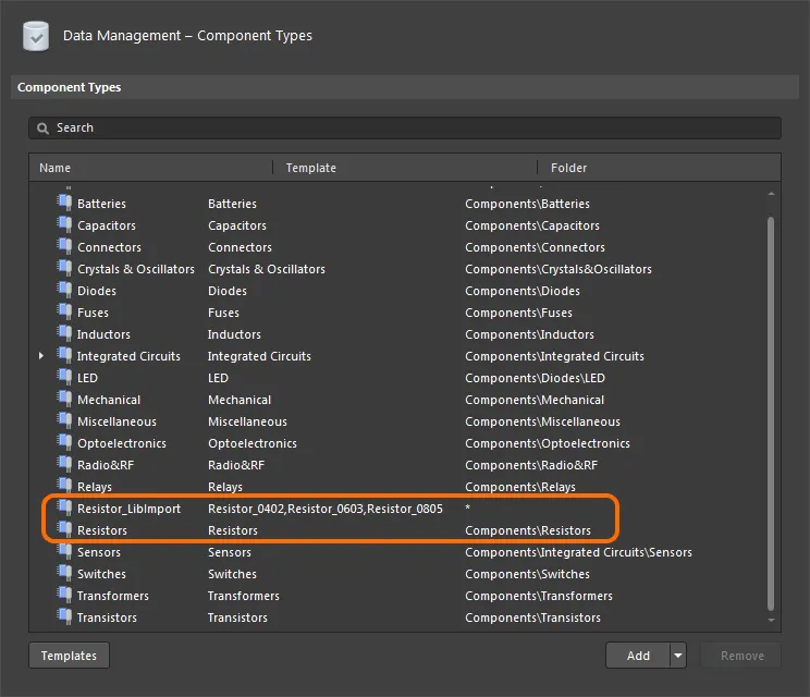 The result of the updated template-type mapping is shown in the Data Management – Components Types page, which has a Name orientated listing – where Name represents Component Type. This indicates that a number of different templates (Resistor_0402, Resistor_0603, etc.,) are associated with and will apply the Resistor_LibImport Component Type.