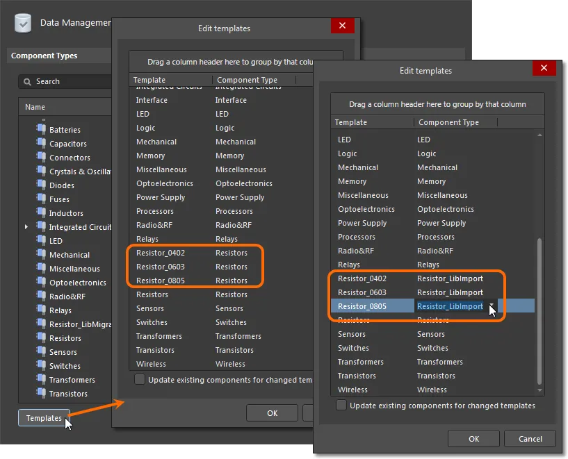 Use the Update existing components for changed templates option to automatically apply the updated Component Type entry to components that used the prior type. For example, if a Component Type setting is changed from LED_SMT to LED, then components that were set to the LED_SMT type will automatically be changed to have the LED Component Type.