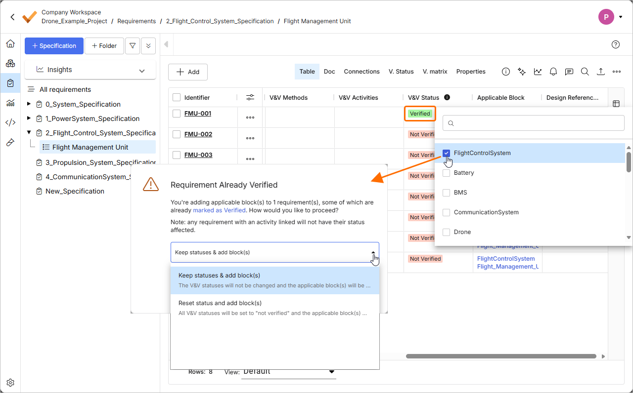 • When adding an applicable block to a requirement which V&V Status was manually set to Verified, you will now get a warning that the requirement was already verified. Use the warning window to choose either to keep the V&V status of the requirement or reset the status (set it to Not Verified) while adding the block.