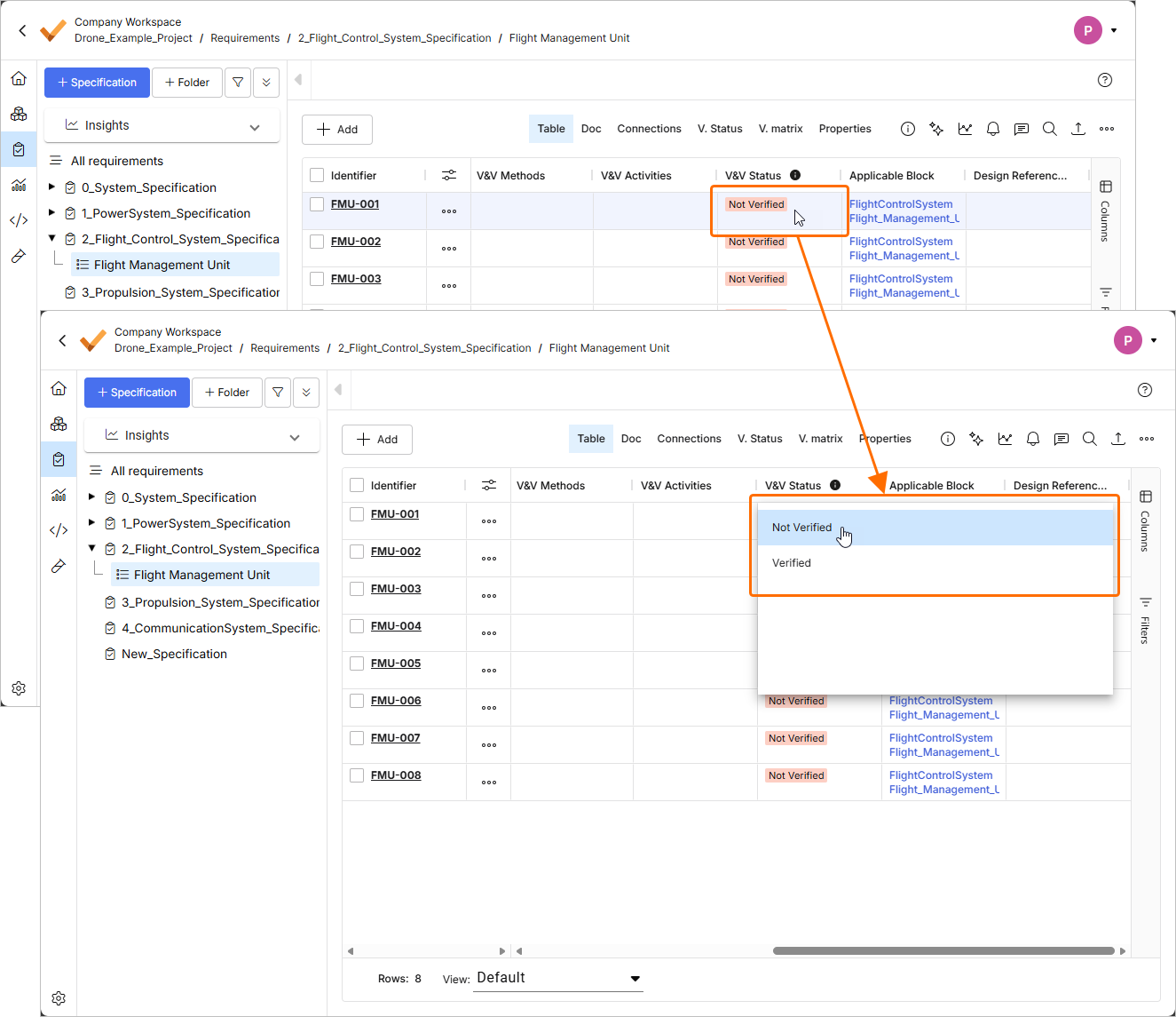 • For requirements that have no assigned V&V activities, you now have the ability to manually define their V&V status. Double-click the requirement's V&V Status cell and select either Verified or Not Verified from the menu that appears.